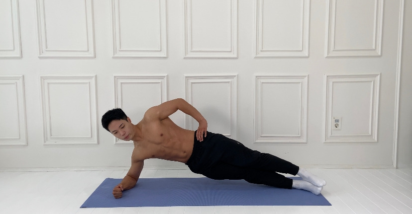 - 한 팔로 바닥을 지탱한 후 무릎을 바닥에서 때고 버티시면 됩니다.