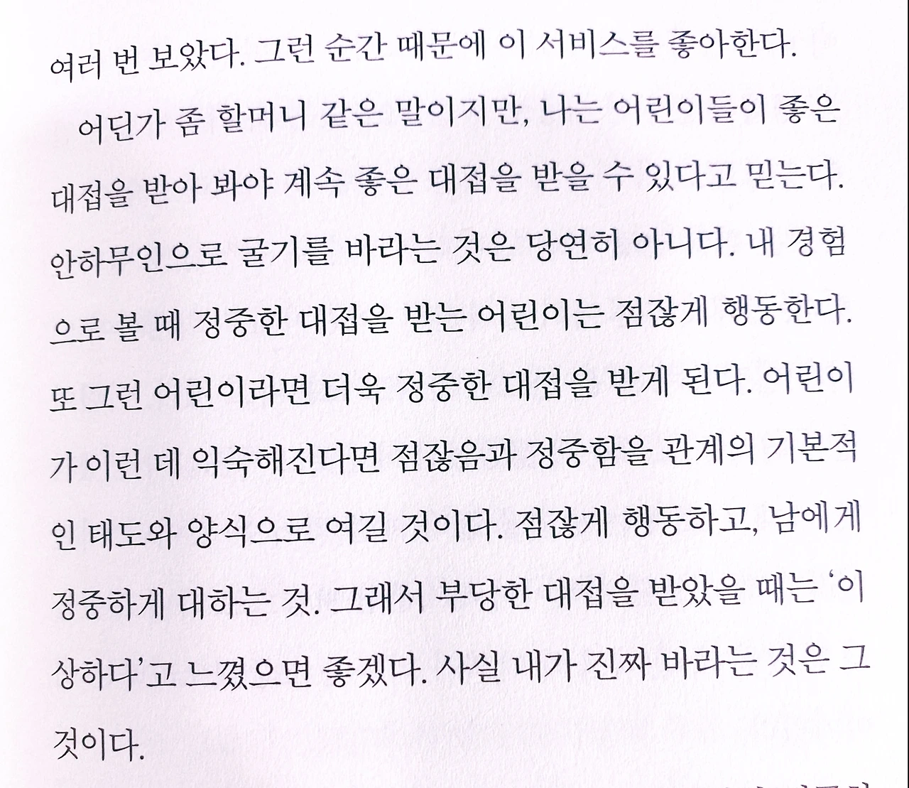 책에 좋은 부분이 참 많았는데 그새 또 다 기억이 나지 않는다. 읽으면서 참 좋다고 생각했고, 나도 모르게 미소 짓기도 했다. 어린이에 대한 책이지만 어른들을 위한 책인 것 같다. 진짜 어른이 되기 위해 꼭 봐야 할 책. 이 책을 많은 사람이 읽었으면 좋겠다고 말했던 팟캐스트 진행자의 마음을 알 것 같다. 나도 많이 추천하고 다녀야지.