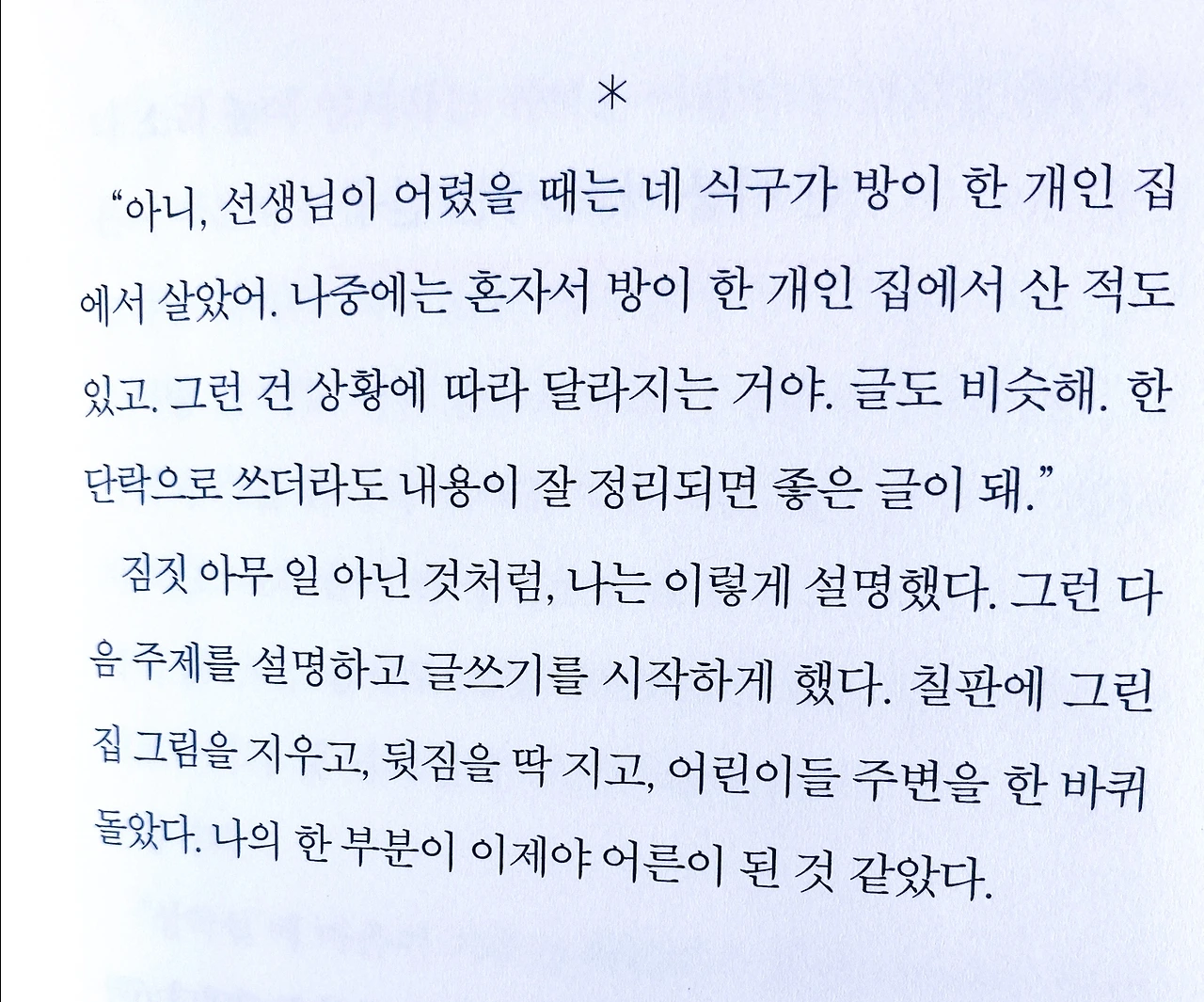 김소영 작가는 방송에서 이런 말을 했다. '아이를 낳아서 길러 보지 않아서 쉽게 생각한다고, 고 말할 수도 있지만.' 그렇게 생각하는 사람이 있다면 아마 책을 읽지 않은 게 아닐까. 책을 읽으면 작가가 아이들을 너무나도 사랑하는 것이 느껴진다. 사랑하고, 존중하고 싶어 하고, 존중받게 하고 싶어 한다는 느낌. 그리고 어린이들에게 본인이 배운다는 것을 항상 인정한다. 그런 그녀의 모습이 더욱 어른 같아서 참 좋았다. 그냥 어른 말고 '좋은 어른'. 요즘은 아이를 낳아서 기른다고 무조건 좋은 어른이라고 볼 수도 없다.
