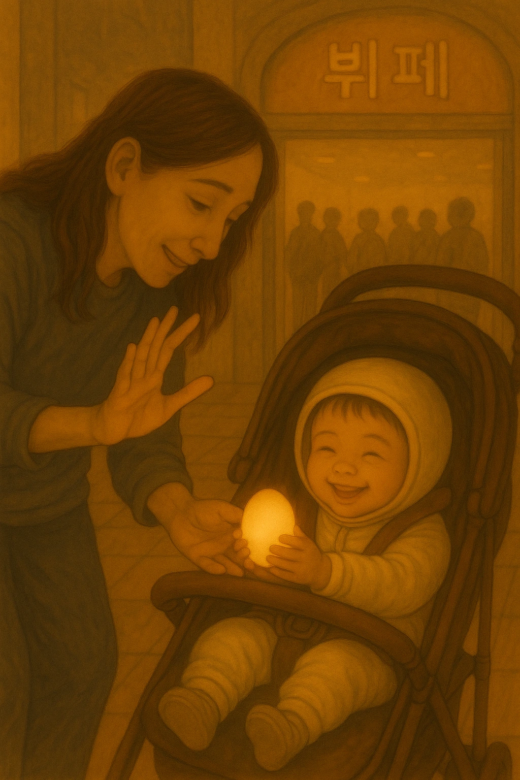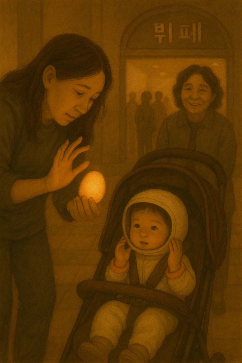 줄로 돌아오니 채아는 유모차에 앉아 사람들을 구경하고 있었다.