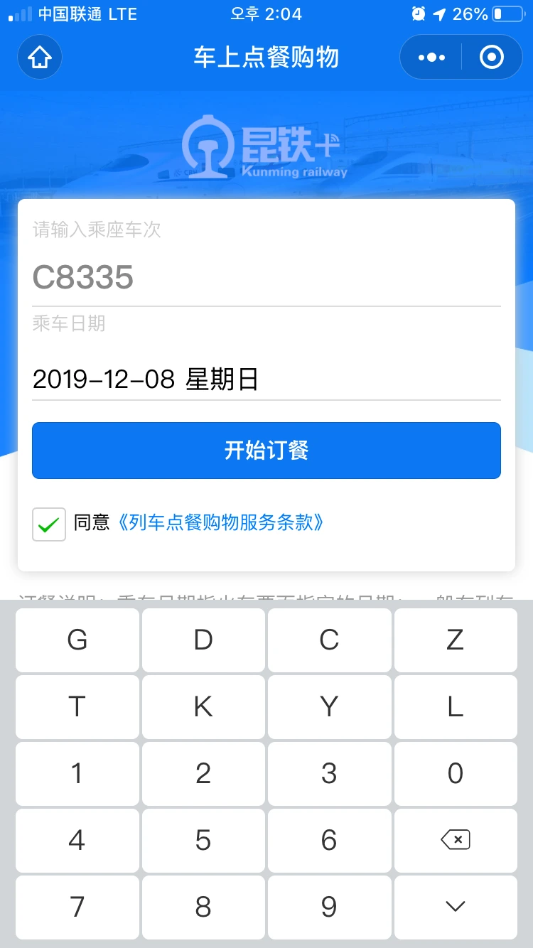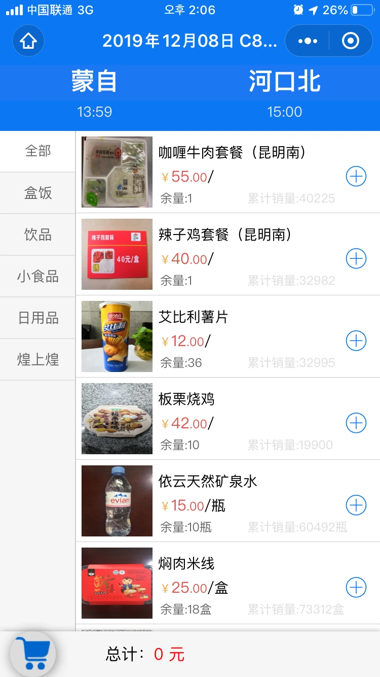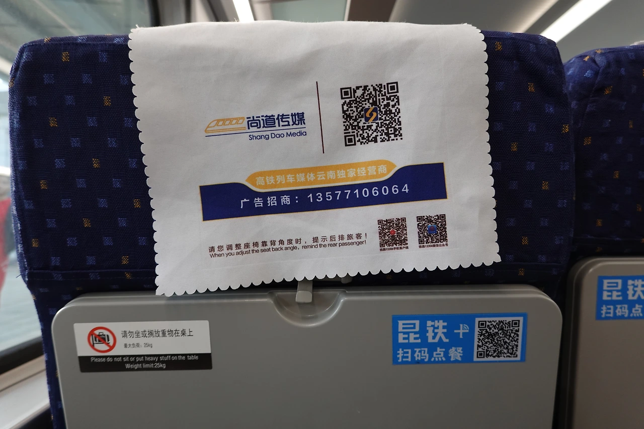 쿤밍에서 베트남 접경지역 허커우로 가는 도시 간 급행열차에서는 모바일로 식사나 간식을 주문할 수 있다. 별도 앱을 다운로드 받을 필요 없이, 좌석 앞에 붙어있는 QR코드를 스캔하면 주문 화면으로 연결된다. 메뉴와 열차 번호, 좌석번호를 입력하고 모바일 결제까지 마치면, 잠시 후 승무원이 주문한 식사를 자리로 가져다준다. 한국에서는 못 보던 서비스라 체험삼아 시도를 해보았다.