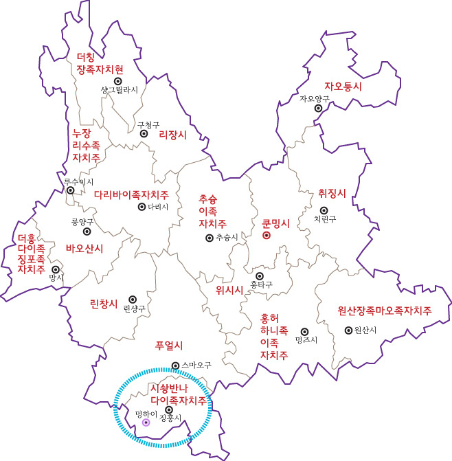윈난성 최남단에 위치한 시솽반나태족자치주(西双版纳傣族自治州)는 가장 이색적인 중국이라 할 만하다. 미얀마, 라오스와 국경을 마주하고 있는 열대지방인 데다 태국 민족과 같은 다이족(傣族, 태족) 집거지이기 때문이다. 시솽반나 중심지 징훙(景洪, 경홍)의 신흥 광광지구 가오좡시솽징(告庄西双景)에서는 도심을 사선으로 가로지르는 란창강(澜沧江)을 볼 수 있다. 시솽반나 지역을 끝으로 중국 국경을 넘는 순간 이 강의 이름이 메콩강으로 바뀐다. 티베트에서 발원해 윈난을 거쳐 남쪽으로 향하는 ‘동남아의 젖줄’은 미얀마, 라오스, 태국, 캄보디아, 베트남을 통과하며 남중국해로 흘러간다. 열대식물 가로수와 공작새 문양 장식, 코끼리 조형물이 즐비한 징홍의 거리 풍경은 마치 동남아에 온 것 같은 착각을 일으킨다. 공항 벽에 줄지어 붙은 푸얼차(普洱茶, 보이차) 광고판이 아니었다면 이곳이 중국임을 실감하지 못했을 것이다.