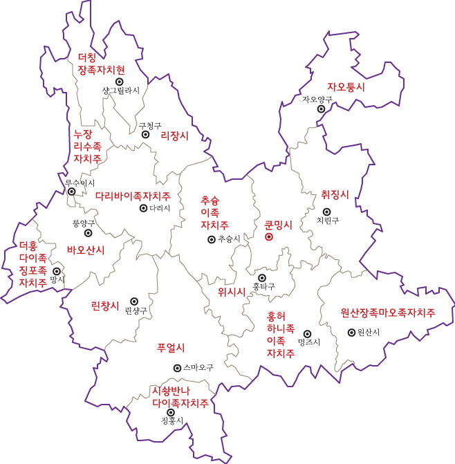 이 드라마를 보다가 재미있는 지명을 알게 되었다. 주인공 양미가 여행사와 휴가지를 상담하는 장면에서 등장한 ‘쿤다리’. ‘쿵따리 샤바라’가 연상되는 이 단어는 쿤밍(昆明, 곤명), 다리(大理, 대리), 리장(丽江, 여강)의 줄임말이었다. 윈난에서 가장 유명하고 볼거리도 풍부한 여행지 3종 세트을 일컫는다. 쿤밍(1,890미터)에서 다리 고성(2,000미터)을 거쳐 리장 고성(2,400미터)으로, 고도를 차츰 높여가며 북쪽으로 향하는 노선은 고산증 예방에도 좋은 윈난 입문 코스다. 한국 직항이 있는 쿤밍에 내려 여행을 시작할 경우, 기차로 2시간 정도면 다음 도시로 이동할 수 있어 교통도 편리하다.
