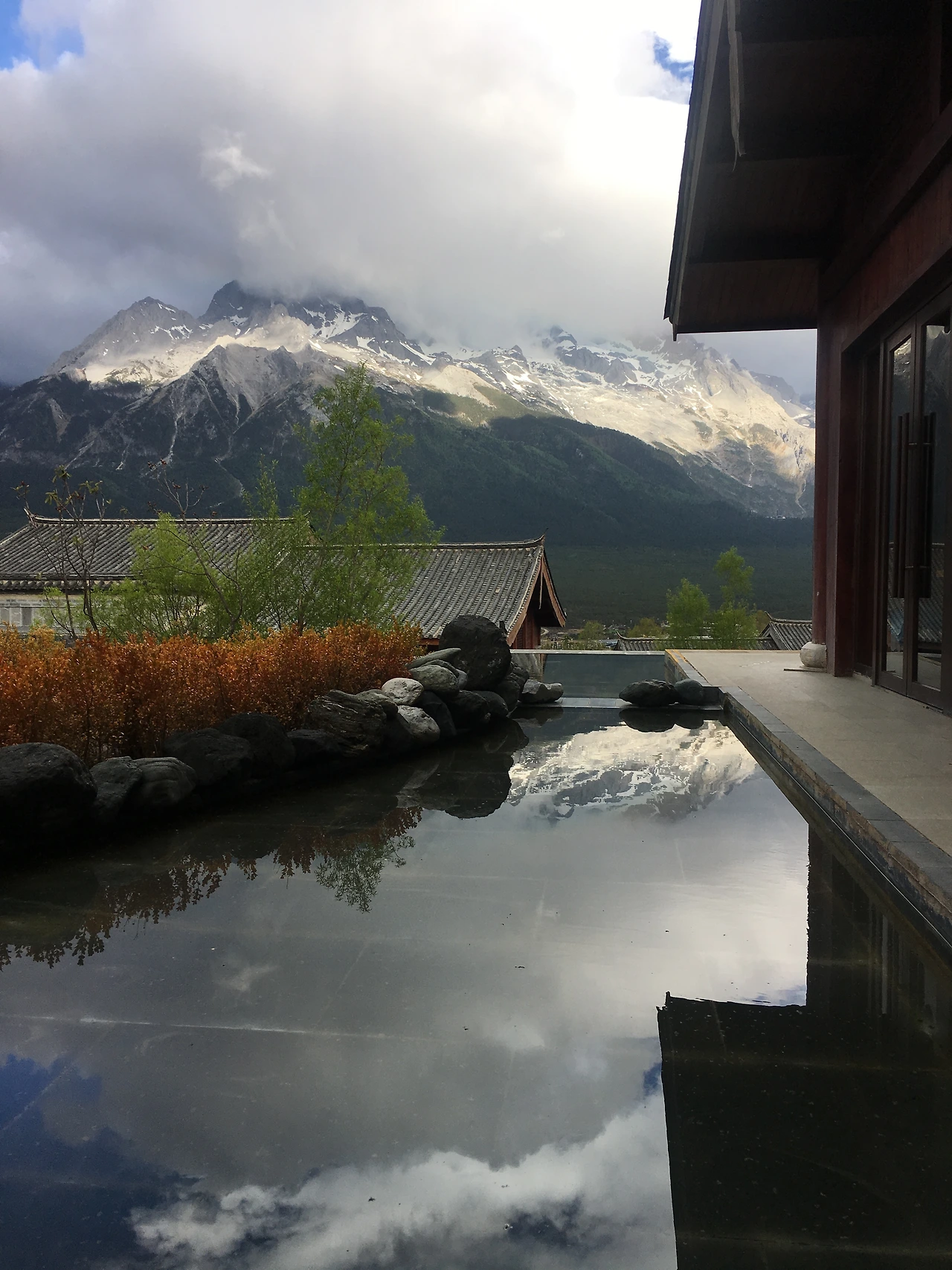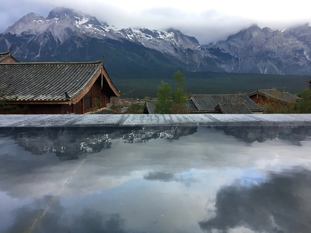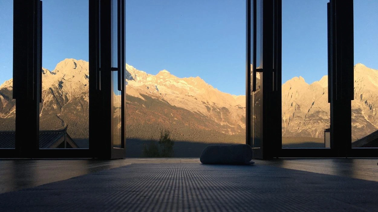 타임랩스 영상을 찍을 스마트폰을 테라스에 설치해두고, 여명이 밝아올 무렵 방을 나섰다. 휴대전화 손전등을 발밑에 비추며 본관 건물을 지나 긴 복도를 통과해 요가실을 향했다. 시야가 탁 트인 건물 정면으로 위롱쉐산이 보이고, 수공간에 설산이 비쳐 가장 아름다운 일조금산을 촬영할 수 있다는 장소다.