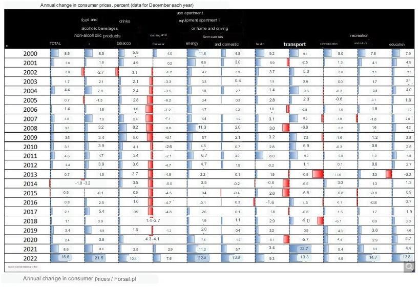 참고: 폴란드의 21세기의 인플레이션(2000년과 현재 물가 비교 기사, 1월 발표치 기준)