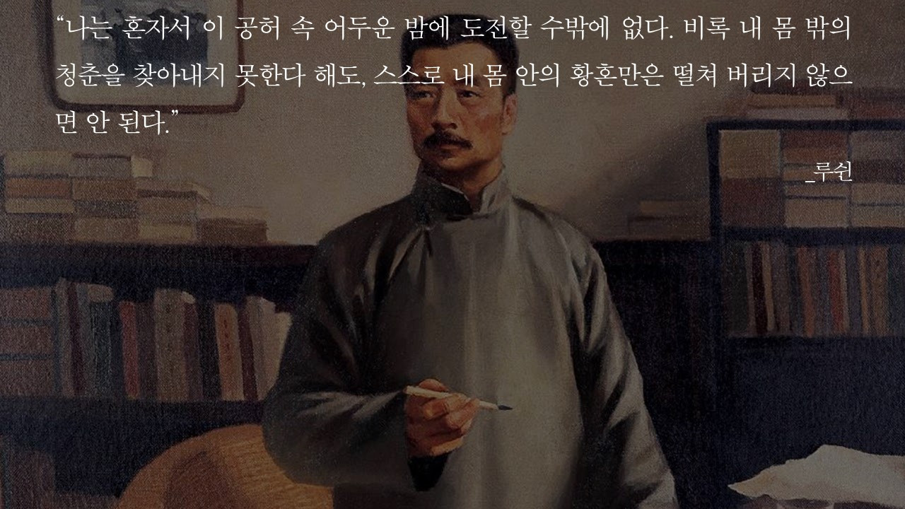 “나는 혼자서 이 공허 속 어두운 밤에 도전할 수밖에 없다. 비록 내 몸 밖의 청춘을 찾아내지 못한다 해도, 스스로 내 몸 안의 황혼만은 떨쳐 버리지 않으면 안 된다.” _루쉰