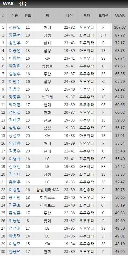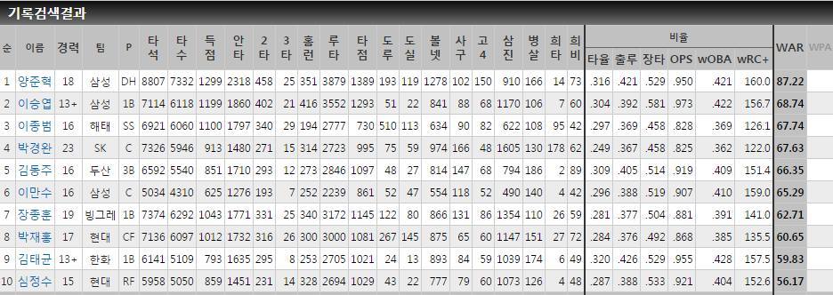 딱 여기에서 끊었다. 사실 이 밑으로도 통산 WAR 수치가 조밀조밀 몰려 있기 때문에 계산법에 따라 얼마든지 역전이 가능하지만. 그냥 내 느낌에 여기까지 끊는 것이 적절할 것 같았다. 이 그룹까지는 누가 뭐래도 KBO를 대표할만한 레전드급 선수들이다.