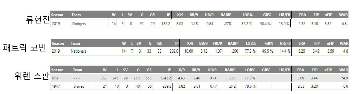 2019년의 류현진은 굳이 좌완으로 한정짓지 않더라도 분명 리그 최고의 투수 중 하나였다. 기록이 증명한다. 2.32의 ERA로 생애 첫 타이틀을 획득했으며, 9이닝 당 내준 볼넷은 1.18에 불과하다. 경이로운 수준이다. 웬만한 경기에서는 볼넷을 한 개도 내주지 않았다는 이야기다. 그렇다고 올해의 류현진을 피네스 피처(구위보다는 제구에 강점을 가진 투수)로 한정지어선 안 된다. K/9이 8을 넘을 정도로 탈삼진 역시 솔찬히 잡아냈기 때문이다. 팬그래프는 류현진의 2019시즌 WAR을 4.8로 산정했다. 어느 시즌이더라도 사이영 컨텐더가 되기에 충분한 퍼포먼스였다. 참고로 리그를 대표하는 좌완 데이비드 프라이스가 2012년 AL 사이영상을 받았을 때 그의 F-WAR는 4.3이었다. 그렇다면 이렇게 뛰어난 성적을 내고도 류현진은 왜 워렌 스판 어워드의 수상자가 되지 못했을까?