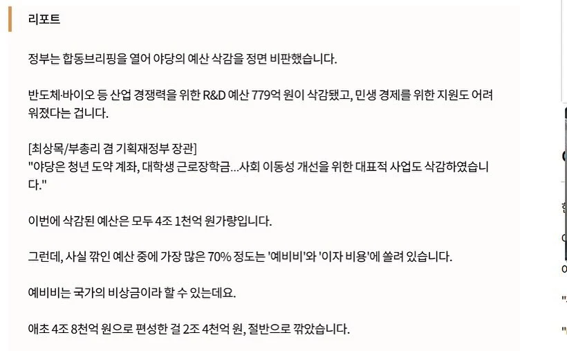 야당의 예산안 삭감을 전면 비판한 정부 부처의 합동 브리핑을, 다시 조목조목 비판한 기사였다. 건조한 팩트를 넘어서는, 특정한 관점을 담은 기사는 언제든 비평의 대상이 될 수 있다. 기자로 주관을 섣불리 섞어선 안되겠지만, 민주당이 삭감안을 도출하는 과정과 그 내용도 그리 훌륭하다고 생각하진 않았다.