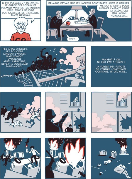 <68년, 5월 혁명>은 만화라는 수단을 이용해 격정의 날들을 담담하게 그려낸다. 프랑스의 주간지 <르 누벨 옵세르바퇴르>의 표현처럼, '제 9의 예술'은 혁명의 흐름을 관조할 수 있게끔 절제있는 표현을 이뤄낸다. 사실 혁명이라는 것이 그렇지 않은가. 돌이켜보면 마냥 아름다울수만은 없는 것이다.