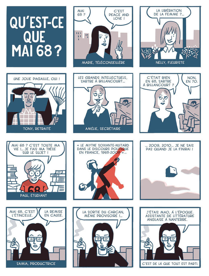 구글에 'mai 68 (68년 5월)' 을 검색하면 천편일률적인 그림이 등장한다. 시민들이 스크럼을 짜고 행진하는 모습이라든가, 사르트르같은 지식인이 대중 앞에 서있는 모습, 시위대와 경찰의 대치 상황같은 이미지들. 그만큼 우리가 68년 5월을 단편적으로 기억하고 있음을 보여주는 증거라고 할 수도 있겠다. 68혁명은 어느덧 반세기가 지난 일이고 이제는 그 사건을 간접적으로 경험한 이들이 훨씬 많아졌다.