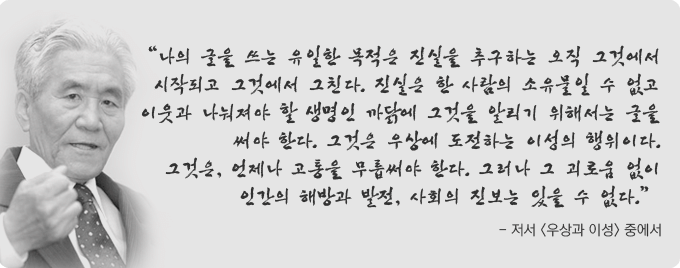 '알랭 바디우도 마오이스트였다지. 아마 문화대혁명이 어떤지 실제로 몰라서 그랬을거야. 그런 지성인이 오류를 범했을 것이라 누구도 생각지 못했지. 68혁명 당시에도 마오이즘이 주요 세력 중 하나였고. 사르트르도 공산주의자였어. 우리 사정은 아무것도 모르는 상태에서, 공상을 펼치며 북한의 승리를 바랐다고 하니까 말이지. 그게 어마어마한 과오도 아니야. 시대가 그랬으니까. 좌파 철학자 피에르 부르디외가 공산당에 가입하지 않은 사실이 특이하게 여겨지는 시대였잖아. 그래, 그때는 그런 때였어. 리영희 교수도 어쩔 수 없었을거야. 그라고 어떻게 다 진실만을 알고, 말하겠어. '