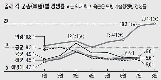 조선일보에서 2014년에 내놓은 통계자료다. 의무경찰의 경쟁률이 20:1을 넘긴 것을 관찰할 수 있다. 공군도 10:1에 육박하는 경쟁률이다. 물론 육군도 높은 경쟁률이다. 그러나 의경-공군의 경쟁률과 육군의 경쟁률은 숫자뿐만 아니라 내용도 다르다. 전자가 고르고 골라진 선별된 인원들의 각축전이라면, 후자는 밀리고 밀려 어떻게든 들어가려는 마음급한 예비장병들의 모임이다.