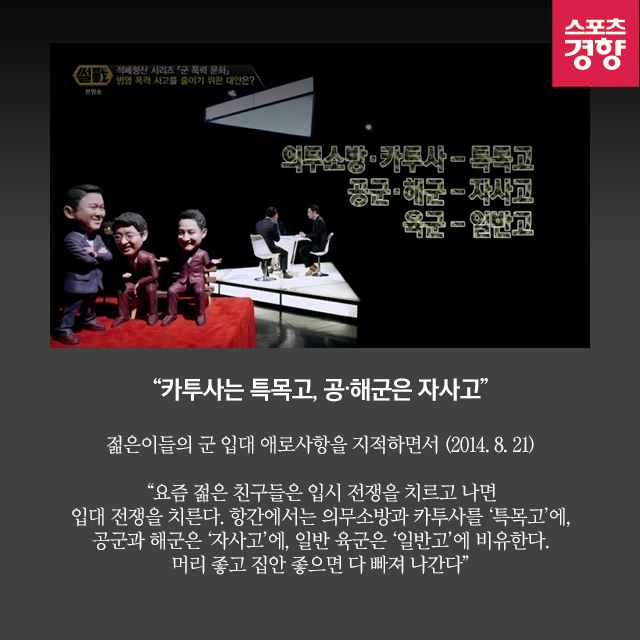 물론 학벌'만'을 기준으로 의무소방과 의무경찰, 카투사를 선발한다는 것은 음모론에 가깝다. 적어도 2016년에는 말이다. '의경고시'라는 말을 듣던 의무경찰은 추첨제로 전환되었다. 한때 사시, 행시, 외시, 카시라는 말까지 붙었던 카투사는 오래전부터 일정기준의 영어점수(이마저도 높다고 이야기할 수 있겠지만, TOEIC 780은 지나친 기준이라 보기에는 어렵다.)를 넘기면 뺑뺑이를 돌렸다. 非SKY를 찾는 것이 하늘의 별따기였던 공군은 수능과 내신기준이 너무 높다는 비판을 받고 선발방식을 바꿨다.