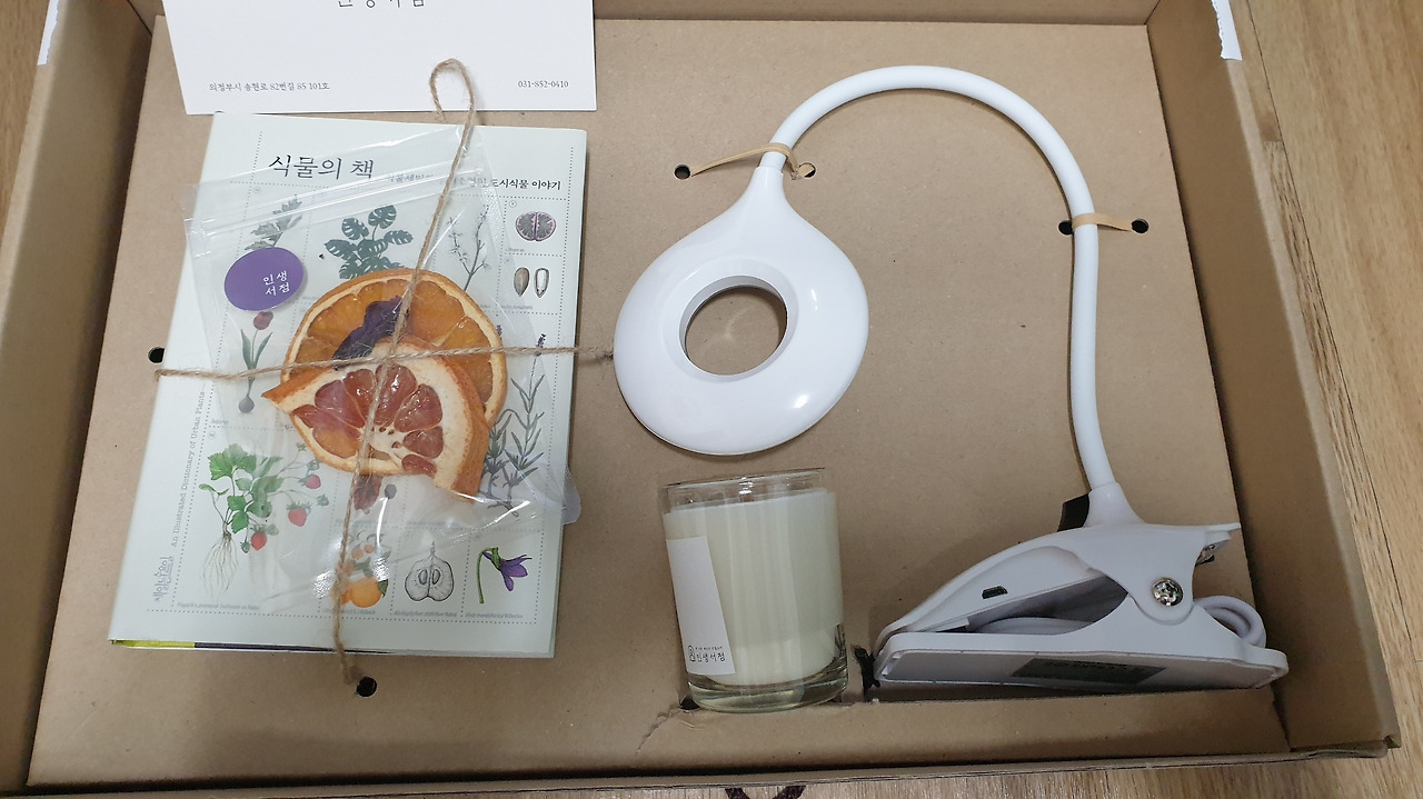 퇴근 하고 도착하니 문 앞에 상자가 하나 놓여있다. 근데 복합기 카트리지 치고는 상자가 꽤 컸다. 택배가 잘못왔나 싶었다. 얼마전에 잘못 온적이 있었다. 하지만 박스 위에 적인 수령인을 확인 해보니 내 이름이 맞다. 발신인도 확인했다. OOO 이름이 낯익다. 전에 같이 일했던 선생님이다. 박스를 열어보니 위 사진처럼 책과, 향초, 그리고 LED등이 예쁘게 포장 되어 있었다.