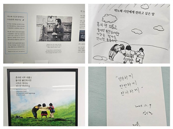 박노해라는 필명이 '박해받는 노동자의 해방'이라는 사실을 처음 알았다. 엄혹한 시기에 사형을 언도받은 한 혁명가의 신념이 이름이 되었다. 한 혁명가의 신념이던 사노맹과 노동의 새벽은 서촌의 한 카페에서 다른 오늘이 되었다. 한 인간이 사형을 언도받는 것은 어떤 두려움과 공포일까. 하지만 박노해 시인은 사형을 언도받는 상황에서조차 환한 미소를 짓고 있다. 전시된 사진 중에서 '단순하게, 단단하게, 단아하게.'라는 문구가 맘에 들었다. 나직하니 두세 번 곱씹어 본다.