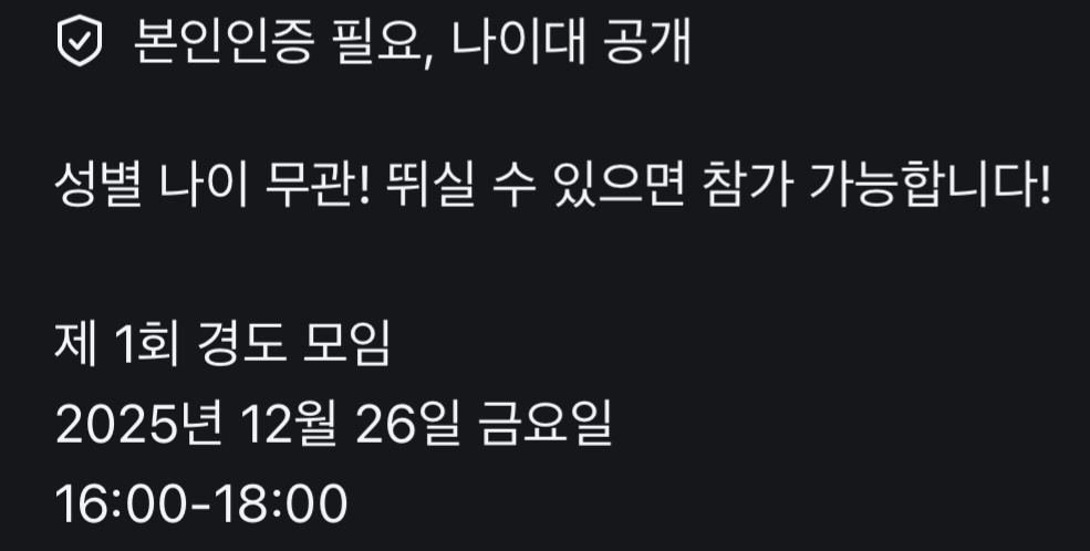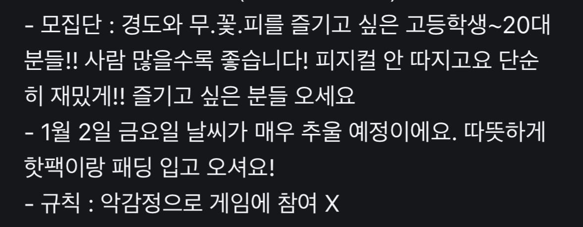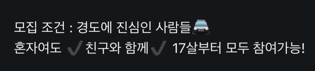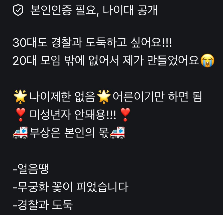 "동네마다 다르고, 경찰 도둑 구분하는 것도 모임마다 다르고, 17세 이상도 있었고, 미성년자 안된다는 방도 있었고, 만나는 시간대도 모집하는 방마다 달라. 약간 번개모임 같은 거라서 정해진 게 없어. 근데 우리가 한 경도는 17세 이상. 퇴근 이런 말도 없이 그냥 8시 이후 동네공원이었어"