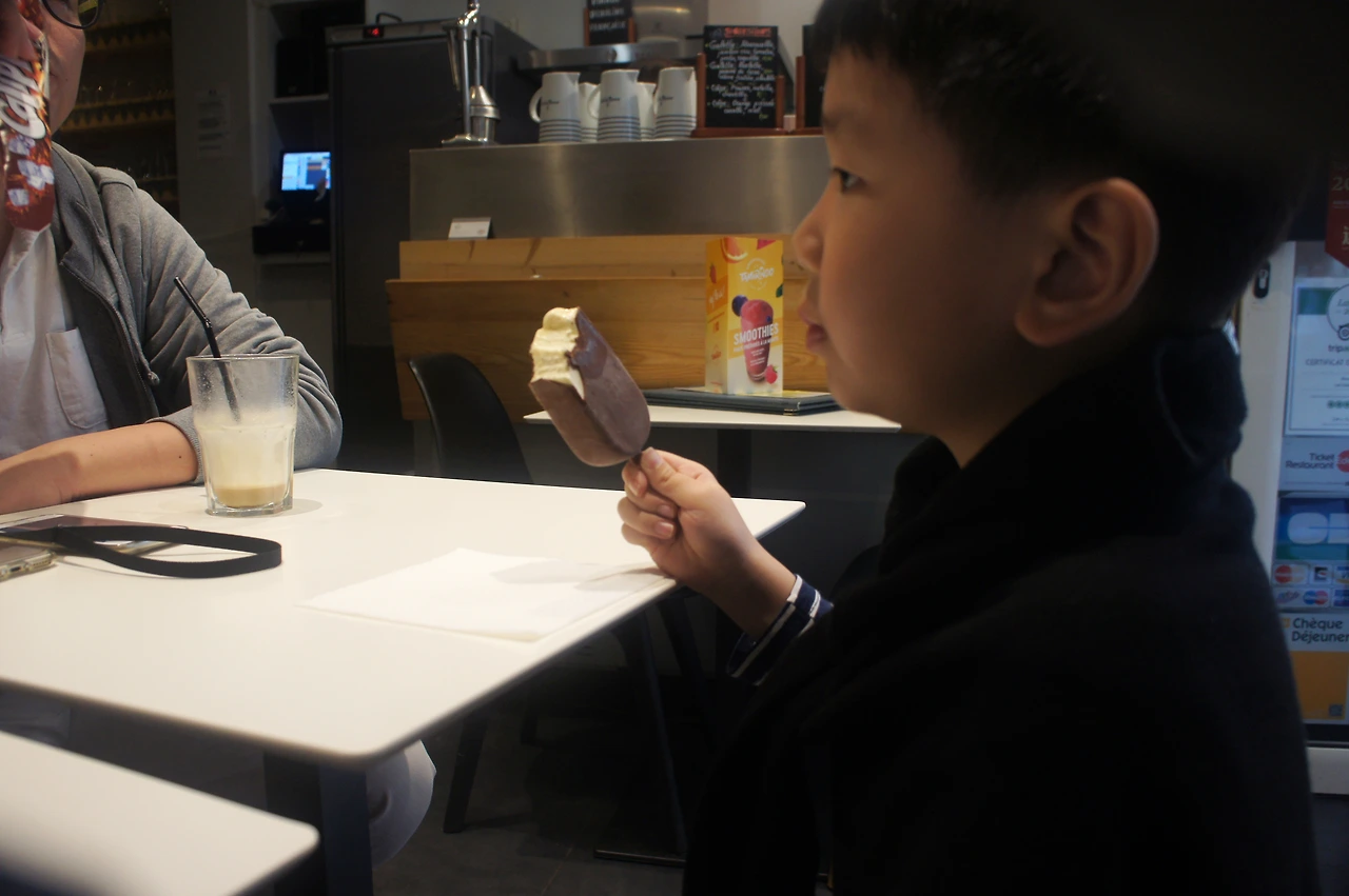 마실거리를 사러 적당한 가게를 찾아 골목을 좀 걷는데 많을 것 같았던 카페테리아 하나가 눈에 띄지않는다. 구글맵을 켜고 걷느라 남편과 나는 정신이 없는데 태오가 문득 걷다 말고 한 곳에 우뚝 멈춰 섰다. 간판도 없는 이 가게의 그 유리창문에 아이스크림 그림이 그려져 있던 것. 구글맵이 다 무슨 소용인가 목마른 자는 스스로 우물을 찾는 법이다. 가게로 들어가 보니 커피도 가능해서 덕분에 모두 즐거워졌다. 태오에게 초콜릿 아이스크림을 하나 쥐어주자 곧 평화가 찾아왔다.