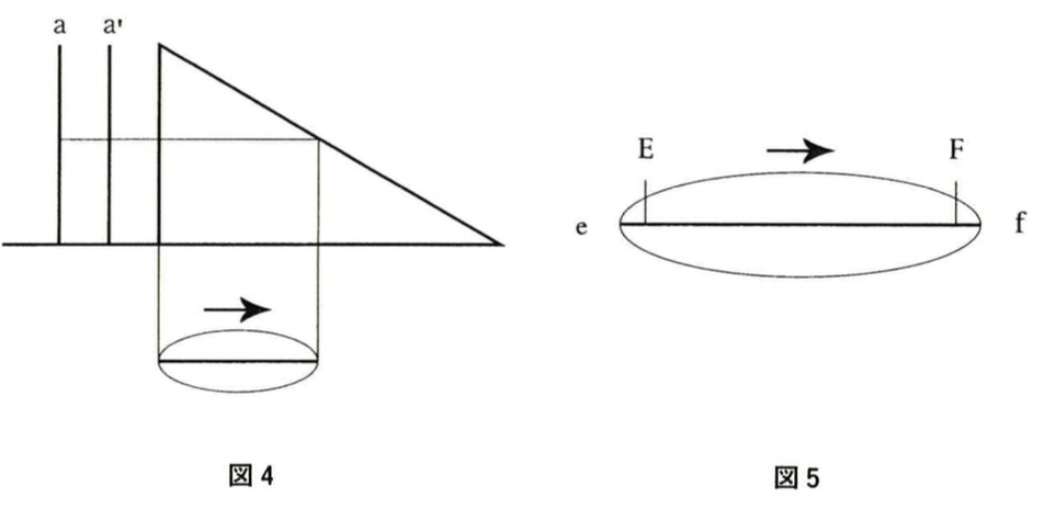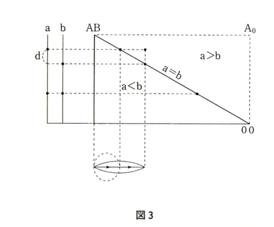 원리적으로는 매우 간단한 것이지만 이 그림이 기본이 된다. 내 이론에서는 '패턴'의 A와 B에 각각 해당하는 강도가 있으므로, 이 공간은 이중으로 그려진다. 기준 빗변은 a=b인 경우를 나타낸다. 여기서 조건은 a≥b이므로, 모든 체험은 그림 3의 오른쪽 위 삼각형의 범위(AB-Ao-OO) 내의 어느 한 지점으로 나타나게 된다. 또한 A와 B의 정상적인 차이를 나타내는 또 다른 거리 개념 d가 있지만, 복잡함은 그 정도에 그친다. 이를 종합하여 나는 이 공간을 '팬텀 공간'이라고 부르고 있다. 이는 본인만 알 수 있는, 아무런 표식도 없는 공간으로, 그런 의미에서 진정한 '환영'이기 때문이다. 인간의 경우 지식, 도식으로서의 객관적 공간 도식이 성립되어 있으며, 일반적인 의식에서는 이쪽이 항상 주목의 대상이 되어 '흔적 공간'으로 간주되지만, 체험에 대한 직결도, '패턴' 우위성의 축에서 보면 순서가 뒤바뀐다. 팬텀 공간이야말로 의식을 담당하는 직접적인 '몸'이다. '현실' 공간은 그 팬텀 공간 안에 자리 잡은 추상의 영역이다. 게다가 '현실' 공간의 거리가 일정하더라도, 그것은 그때그때의 주체가 부여하는 의미에 따라 팬텀 거리 축 위에서 부유한다. 예를 들어, 현실 공간의 무한 원점은 보통 자극 효과가 제로이므로 팬텀 거리 축의 먼 끝, 즉 유한한 선분 내에 자리 잡는다. 그러나 어떤 이유로 인해 지평선에 주목하게 된다면, 그것은 상당히 가까운 팬텀 거리 점으로 이동하게 된다.