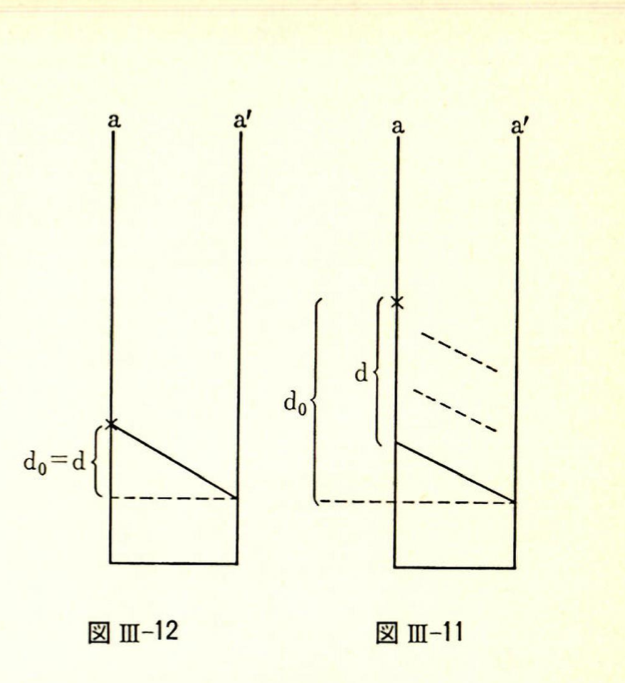 이어서 (a)의 경우다. 'a계의 에너지 일부가 a'계로 흘러들어 고무판이 압축되어 이전과 같은 장력에 도달하지만', 그만큼의 'a 에너지를 낭비하게 된다'고 설명한다. 옆 도식 3-11의 상황이다. a의 수직선에 찍힌 좌표 x를 눈여겨 보며 설명을 따라가 보자. 정상적인 표상이라면 x를 기준으로 d만큼 발생했을 때 그만큼 내려온 a'가 수평으로 있어야 한다. 그런데 탄성체의 탄성률 저하에 따라 밑으로 내려간 a'에 유도된다. 그에 따라 본래 x 만큼의 격차 d0가 나타난다. 즉 정상적인 d가 아니라 d0가 나타나고 d0-d만큼이 손실되는 것이다. 표상에 있어서 이 손실분은 그만큼의 '의미를 잃는 상황'이다.