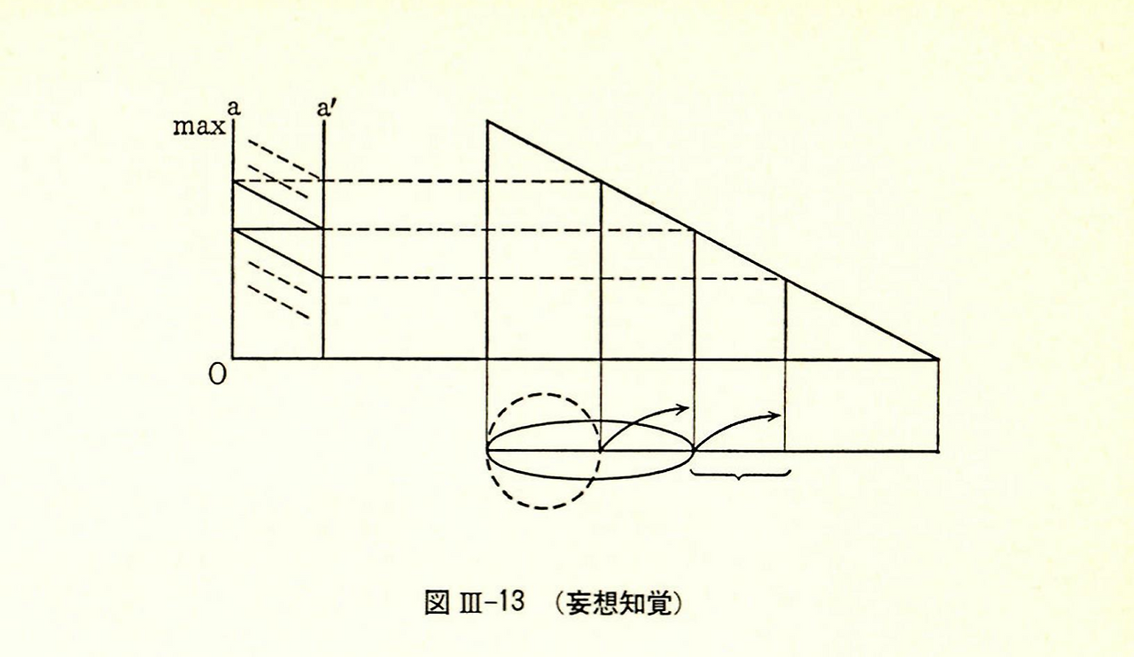 그렇다면 첫 번째와 두 번째 의미 층은 어떻게 되는가? 가설적 장애가 아직 약할 때도 이 첫 번째와 두 번째 의미는 d 부분이 매우 적기 때문에 쉽게 의사 지각화될 수 있다. 하지만 이들은 본래 "양적"이고 지각과 매우 가까운 것이기 때문에, 다시 의사 지각화되더라도 체험 상에서 크게 달라지지 않을 것이다. (병적인 기하학적 사고와 연결될 가능성은 있지만, 망상으로서의 의미는 생기지 않는다.)