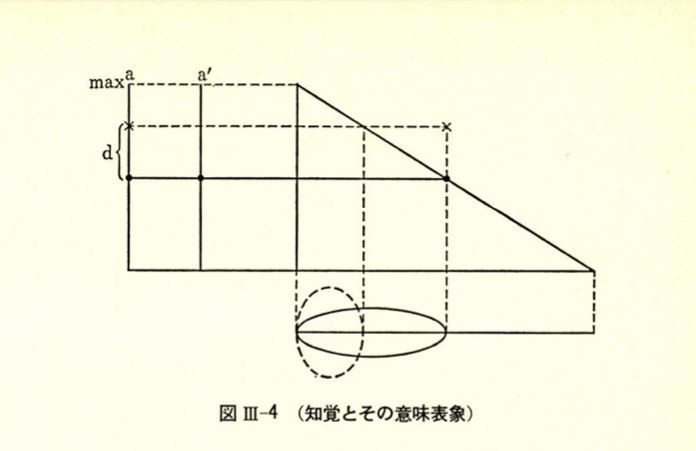 "의미"에도 여러 층이 있고, 그것은 논리적 도식 열을 이루어 체험선에 포함된다. 다시 말하자면, 가장 "양적인" 의미는 우선 개별 대상의 이름, 사전적 개념 등이며, 생생한 체험 전체 중에서 질적인 부분을 가능한 한 버리고 남은 가장 기초적인 형태, 추상이다. 나는 이것을 이해를 돕기 위해 "물체 의미"라고 불렀다. 이는 거의 F의 끝에 위치한다(도식 3-14).