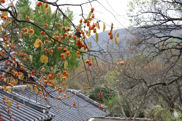 스님의 설명에 한바탕 웃고 다시 담벼락을 따라 계속 걸었습니다. 담벼락 너머로 감이 주렁주렁 열려 있었습니다. 스님은 “방 안에 보관해서 홍시가 된 것보다 나무에 달려 있는 채로 홍시가 된 걸 따먹어야 더 맛있어요.”라고 알려 주기도 했습니다.