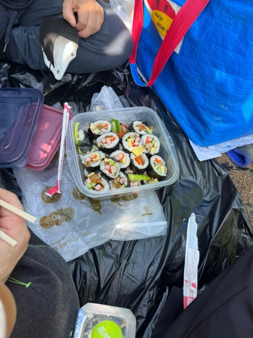 감자 캐낸 곳 위에 비닐을 돗자리 삼아 엄마가 5시에 일어나서 싼 김밥으로 허기진 배를 달래줬다.