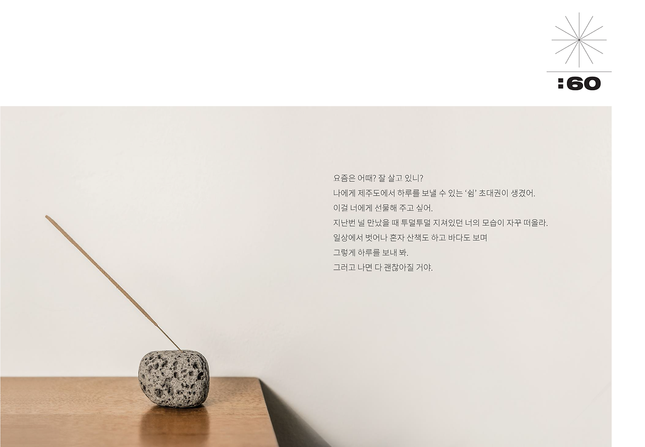 플레이스 캠프 제주 특유의 회색빛 룸에 식스티세컨즈의 따스한 감성이 채워진 모습. 사진으로만 보아도 매력적이다. "여기 나 꼭 갈래!" 댓글을 남겼다. 제주에 갈 이유가 또 생겼다며, 마음속에 위시 리스트로 적어 넣었다. 그리고 얼마 후, 식스티세컨즈에서 뜻밖의 메시지가 도착했다.