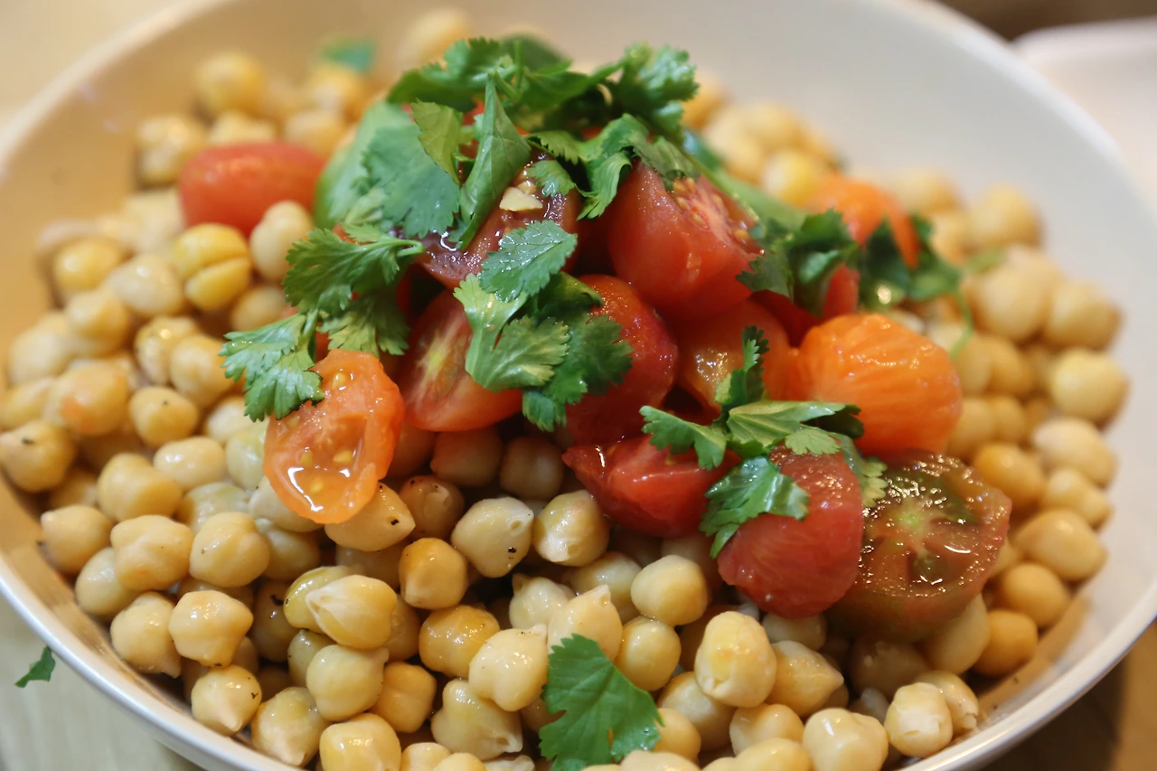 영양가가 높은 병아리콩과 새콤한 방울토마토, 쌉쌀한 고수를 함께 요리하면 색감과 영양이 매우 좋다.