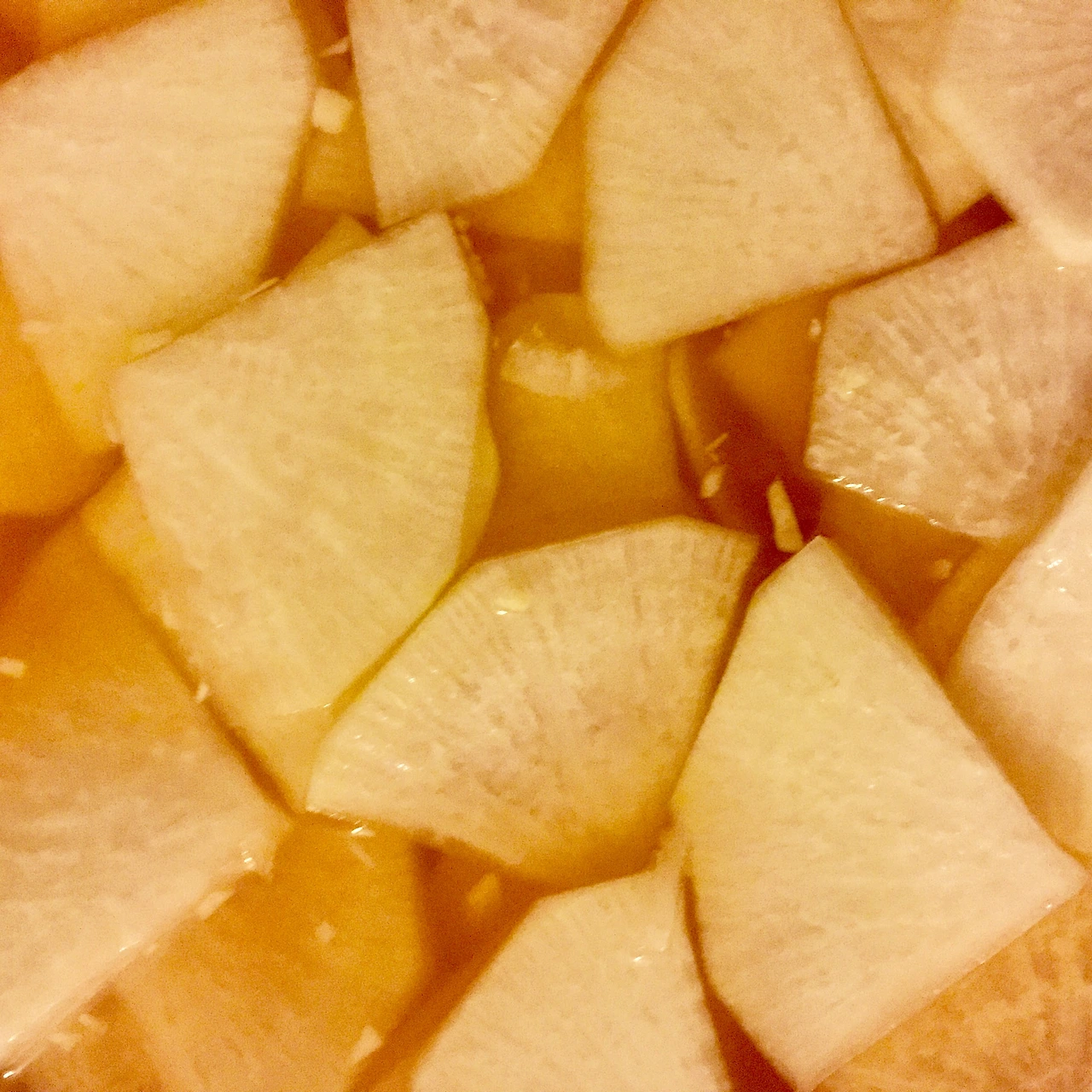 3. 사과즙, 간 마늘 약간, 올리브유, 감식초를 섞어 무가 살짝 잠길 정도로 붓는다.