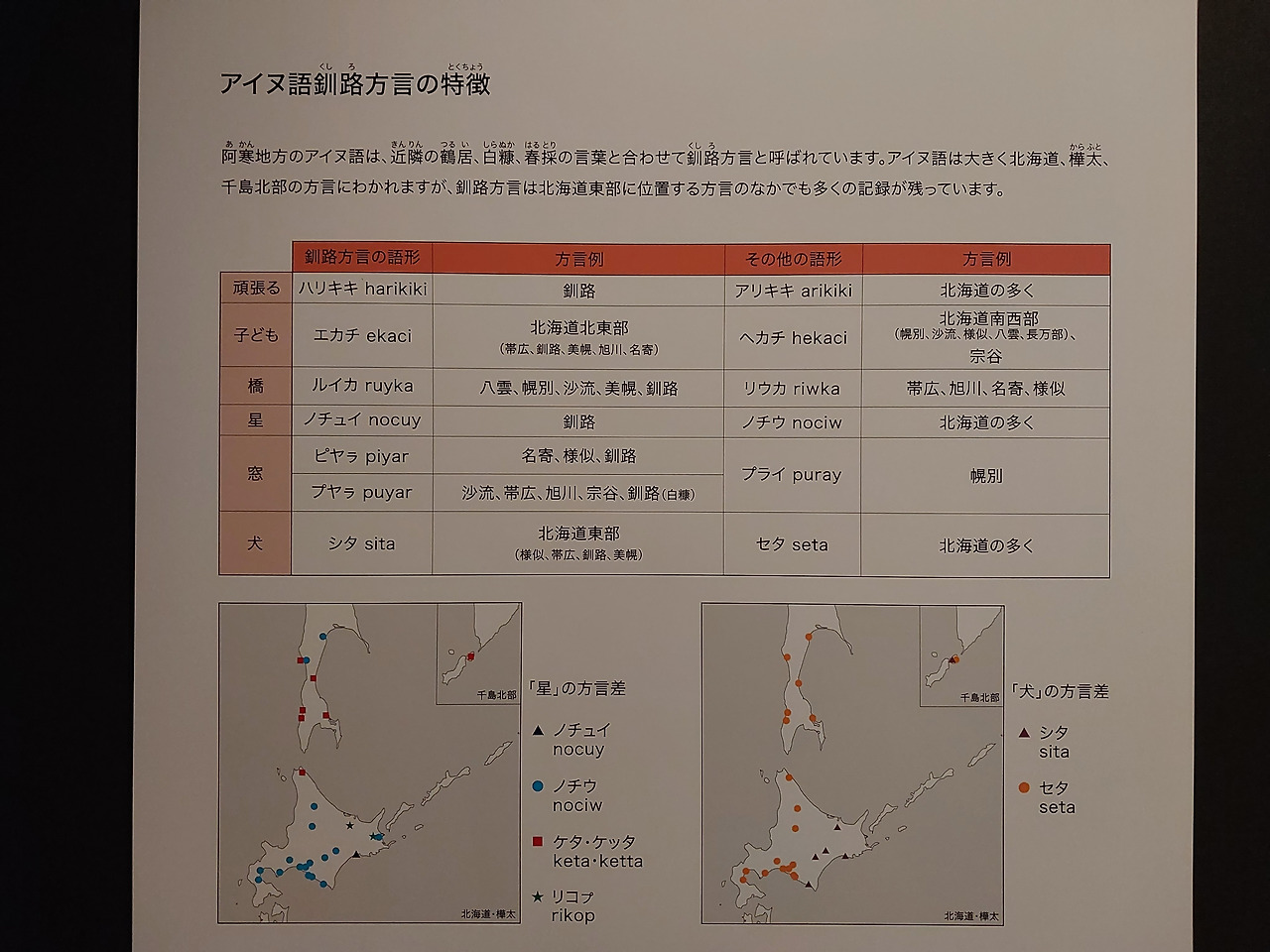 또 내가 갔을 땐 특별전 "아칸토 운 코탄(akan-to un kotan)"을 하고 있었다. 아칸 호(阿寒湖)의 아이누 코탄을 비롯해, 홋카이도 도동 지방의 쿠시로(釧路) 쪽에 사는 아이누에 대한 이야기가 전시돼 있었다. 이 지방의 역사를 설명하는 글을 인용하면 이렇다.