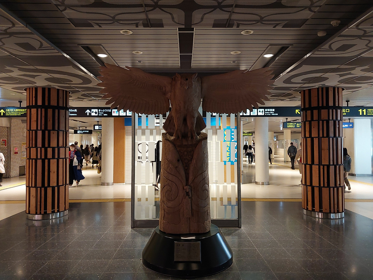 이 이름은 아이누 민족이 마을을 지키는 신으로서 고귀하게 여기는 올빼미 신 "코탄코로카무이(kotan-kor-kamuy, コタンコㇿカムイ)"의 다른 단어일까? 이 조각상의 재료는 사루 강 유역에서 출토된 몇백 년 연식의 느릅나무 매목(埋木)으로, 니부타니의 공예가 카이자와 토오루(貝澤 徹) 씨가 조각했다고 한다. 지하보도의 천장에 닿을 것처럼 꽉 차는 조각상이었다. 천장에는 전통문양이 들어차 있었고, 주변을 지지하는 기둥은 꼭 나무의 질감을 표현한 것 같았다.