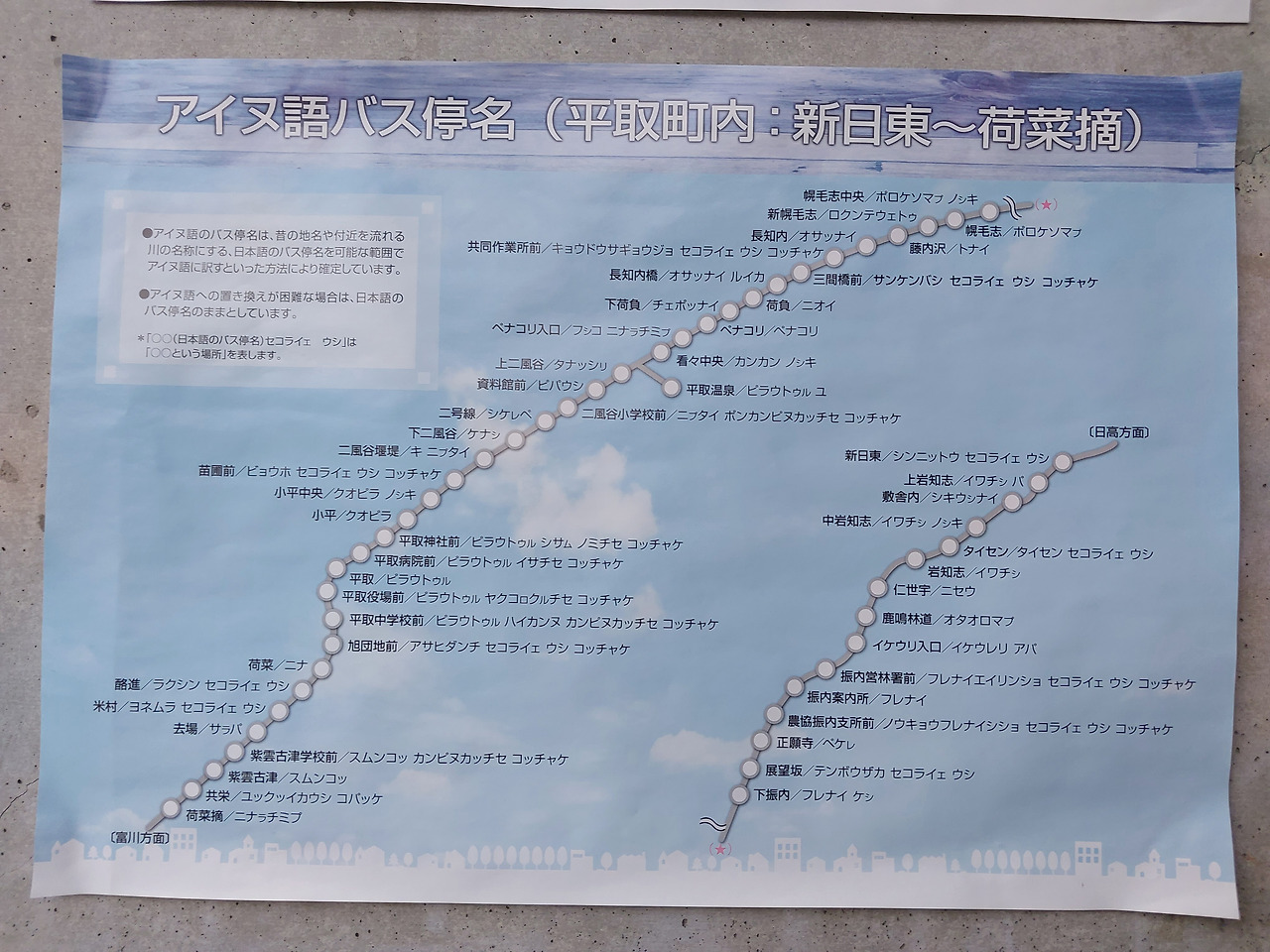 관내에 붙어 있던 아이누어 버스 정류장명. 토미카와 방면과 히다카 방면 일부를 아이누어로 안내방송하게 돼 있었다.