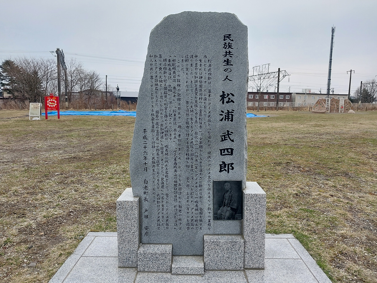 우포포이로 가는 길목에는 에도 막부 말기의 탐험가인 마츠우라 타케시로를 기리는 비석이 있었다. 처음에 언급한 적 있다시피, 지금의 홋카이도란 명칭을 지은 사람이다. 비석은 2014년에 건립한 것이었다. 한국어로 옮기면 비문은 이렇다.