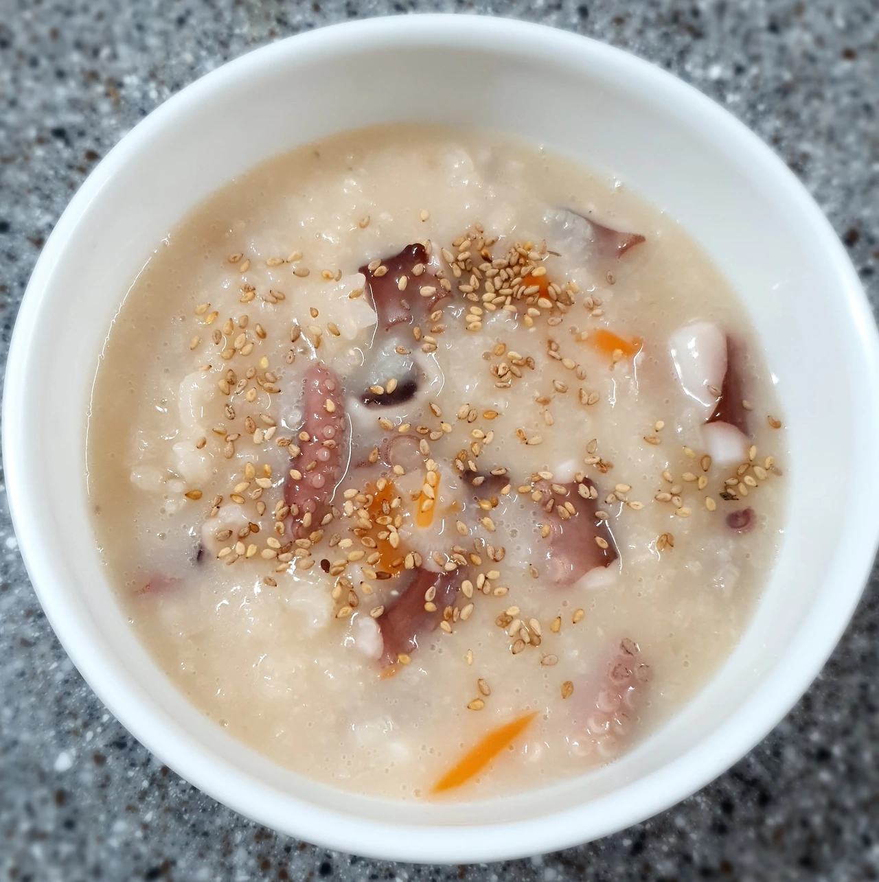 통통한 낙지를 물에 살짝 데치고 잘게 썰어 둔다. 불려둔 흰 쌀과 당근을 볶아 물을 넣고 끓이다가 마지막에 낙지를 넣고 저어 익혀준다. 소금 간을 하고 참기름을 휘 둘러주면 된다.