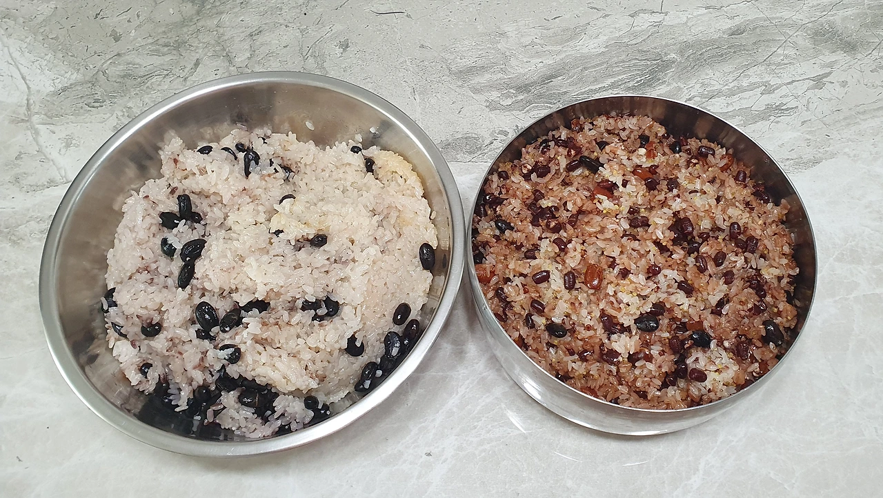 큰 콩이 들어있지만 하얀 찹쌀이 더 많이 보이는 건 아이들 몫, 팥이 들어 전체적으로 붉은빛이 도는 것은 어른 몫이다. 콩이나 팥을 싫어하는 아이들은 흰쌀만 먹으려고 해서 그렇다. 나는 팥이 씹히는 어른 버전 찰밥이 더 좋더라.