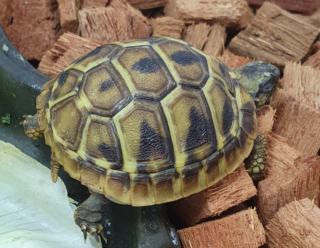 대부분 파충류들이 따뜻한 곳에서 살기 때문에 네모난 사육장으로 가득 차 있었고, 각 사육장에는 도마뱀, 진짜 뱀, 거북(육지, 수생), 개구리 등이 꼬물거리고 있었다. 미리 정해온 동헤르만 육지거북 쪽으로 갔더니 아주 아가, 중간, 더 큰 거북 등 자라온 시간만큼 크기가 다른 거북이 있었다. 작고 어린것이 예쁜 것은 어떤 동물이나 마찬가지라...... 큰 아이일수록 튼튼해서 기르기 쉽다는 주인의 말을 흘려들었다. 엄지손가락만 한 거북에 눈도 있고, 등갑도 있고, 먹이도 먹는 그 모습이 너무 귀여워 "무조건 얘"라고 할 수밖에 없었다. 얼마나 작았느냐면 집에 데리고 올 때 배달음식을 시켜 먹으면 초장이나 간장이 담겨 오는 소스통에 숨구멍을 뚫어 거북을 넣어올 정도였다. 아이들이 미리 지은 꼬부기라는 이름이 잘 어울리는 아이였다.