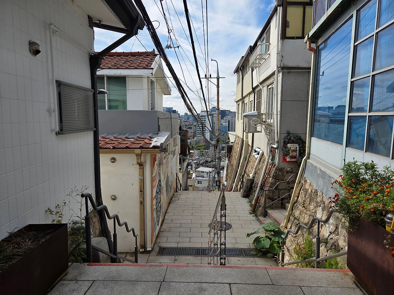 낙산공원에 가기 위해 혜화역에서 내렸다. 1번 출구로 나와 번화한 길에서 벗어나니 높지 않은 건물들이 있는 조용한 동네다. 상명대학교 동덕여자대학교 국민대학교 등 대학건물의 간판이 보였다. 왜 이곳에 대학 건물들이 있지? 의아해하며 언덕을 올랐다. 옛 정취가 남아있는 서울의 강북은 재밌다. 새로 지어진 신도시보다 정감이 있다. 지역의 역사가 느껴졌다. 모양과 색이 다양한 4~5층 건물들, 그리 급하지 않은 언덕길, 사이사이 골목과 축대에 그려진 그림....