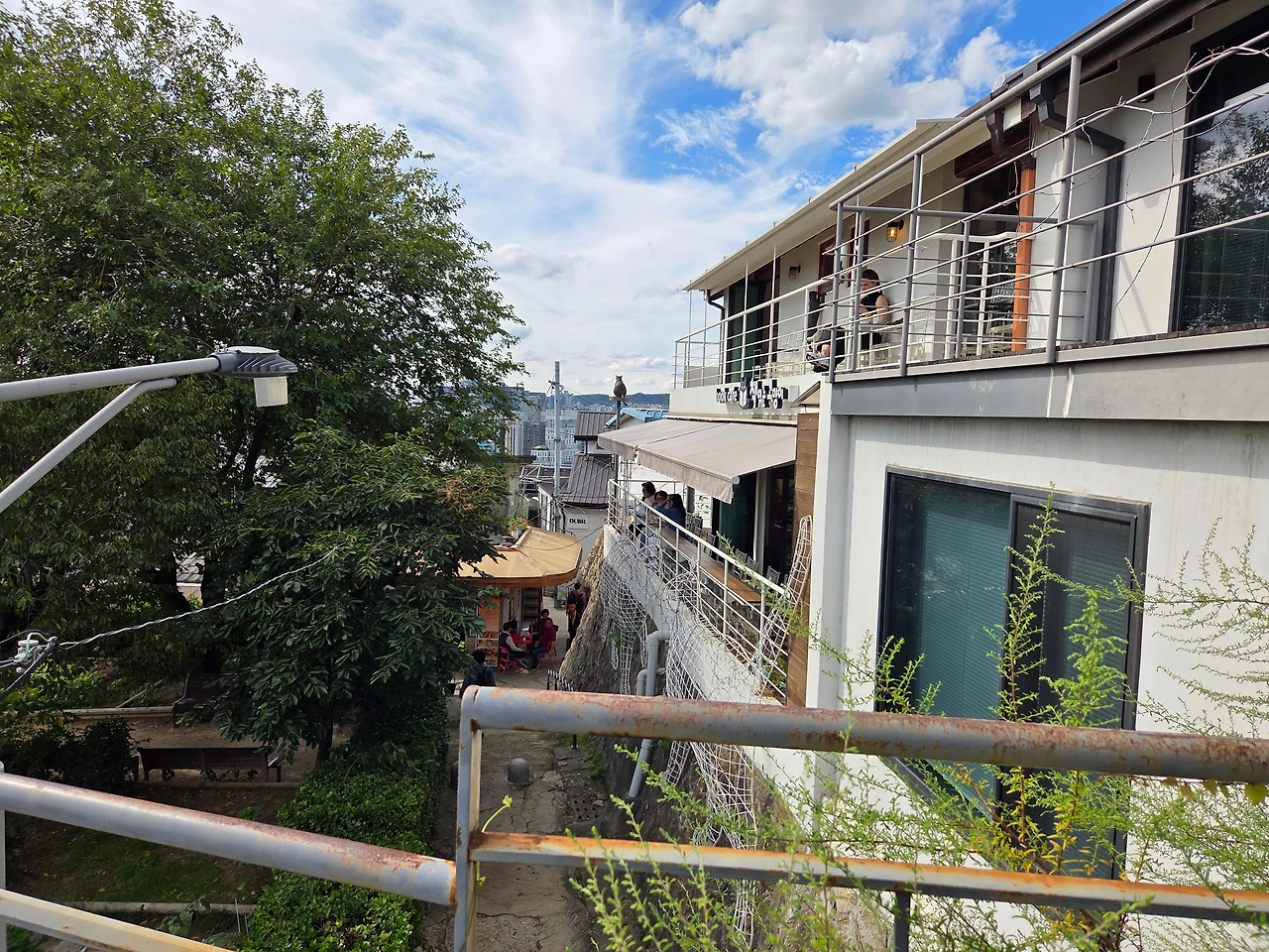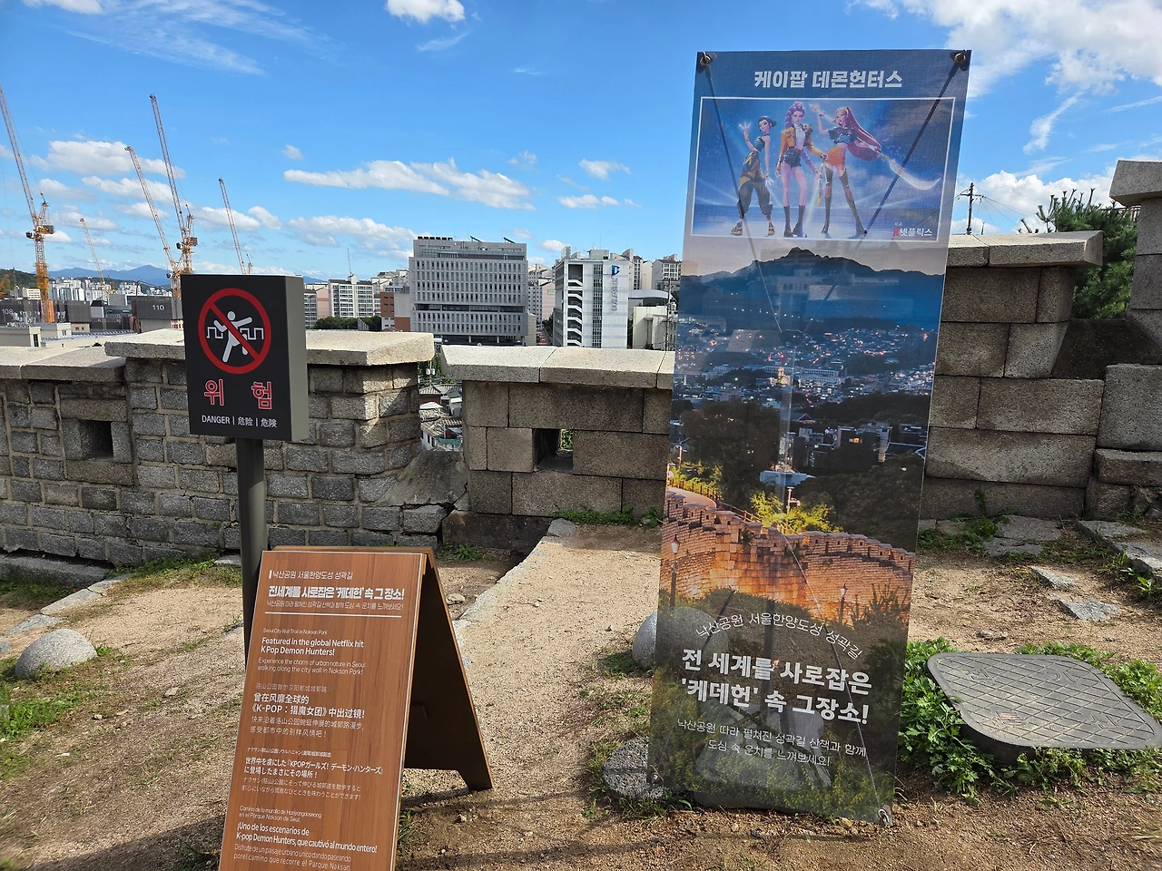 얼마 지나지 않아 낙산공원으로 올라가는 계단이 보였다. 계단을 오르니 성곽과 성 너머에 파노라믹 한 경관이 펼쳐졌다. 거의 한 달 동안 그치지 않았던 비가 오늘은 맑게 개었다. 파란 하늘에 흰 구름이 뭉게뭉게 떠 있는 전형적인 가을날씨였다. 우리는 성곽을 따라 걸었다. 멀리 남산타워가 보였다. 케데헌 촬영장소라는 푯말도 보였다. 흩날리는 갈대 사이로 동대문을 바라보며 걸어내려갔다.