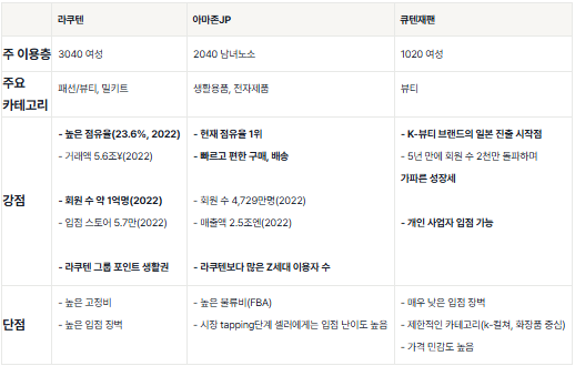 라쿠텐, 아마존재팬(이하 아마존 JP), 큐텐재팬이 일본 3대 이커머스 플랫폼이에요.
