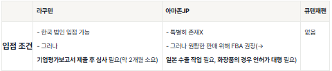 ✅ 다소 까다로운 라쿠텐과 아마존, 입점 조건이 없는 큐텐재팬