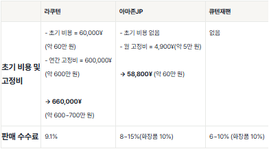 ✔️ 그에 비해 아마존 JP는 한화 약 5만 원의 월 고정비로 연간 60만 원 가량의 고정비가 들고, 큐텐재팬은 초기 비용이 없어요.