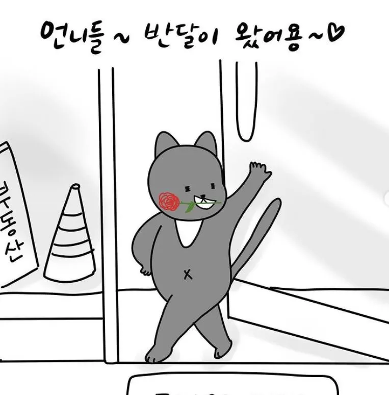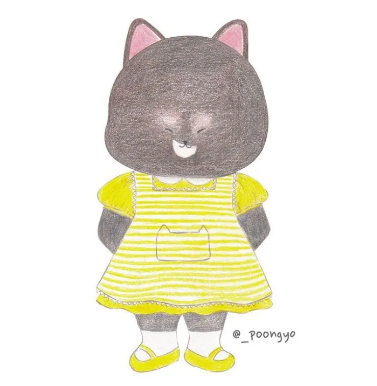 바로 반달이 이 녀석이 뮤즈가 되었습니다. 길냥이였던 반달이는 첫 모습부터 남달랐어요. 까만 턱시도 고양이, 심지어 눈썹마저 검정이라 입 주변이 더 튀어 보였지요. 반달 모양이 선명해서 이름도 반달이가 되었습니다. 사실 반달이와 함께했다고 바로 바느질 소품을 만들수는 없었어요. 대신, 그림이 시작이었습니다. 바로 아래와 같은 식으로요.