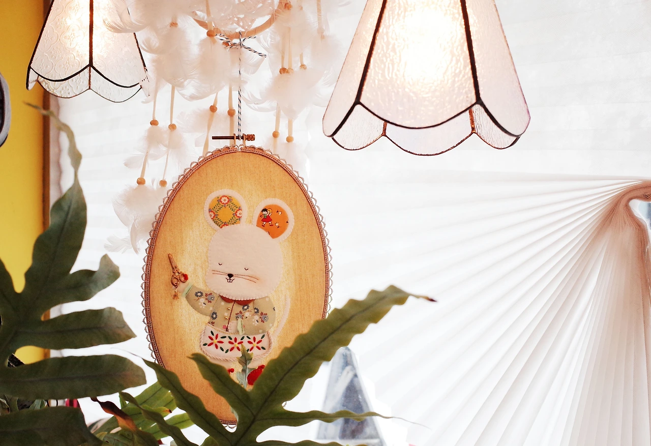 오늘은 공방에 비치는 햇빛이 적어서 내부 조명을 켰어요. 주로 손님이 올 때만 켜고 저희끼리 있을 때는 꺼 놓아요. 오늘 은은하게 조명을 켜놓으니 펠트 아플리케 작품(쥐 모양 캐릭터, 하리)도 '반짝'하면서 존재감을 드러내네요. 공방에 직접 오시는 분들은 한 번씩 꼭 만들어보고 싶다고 해요. 거리 두기가 완화되면 공방에 옹기종기 모여서 하리 수틀 액자 만들기를 진행해보면 어떨까 싶네요.