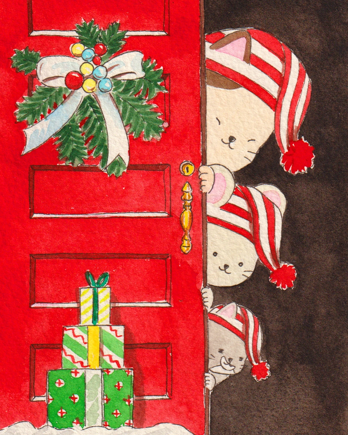 마지막 일러스트는 어제 그린 따끈따끈한 그림이다. 우리 모두 몸은 다 컸지만, 마음속으로는 동네 문방구 앞에서 판매하던 멜로디 카드를 그리워하고 있다. 수업시간에 크리스마스 카드 꾸미기 세트를 오리고 붙여 반짝이 풀로 장식하는 기억들을 떠올리고 있을 것이다. 그 마음이 이번 일러스트에 담겼다. 빈티지 카드를 참조해서 캐릭터들을 그려 넣었다. 소복이 쌓인 눈 위에 놓인 선물 상자들 속엔 무엇이 들어 있을까? 이런 상상을 하다 보면 입가에 저절로 미소가 지어진다.