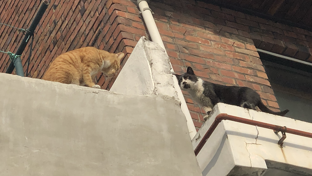시간이 조금 흐른 뒤, 두 녀석도 나타났다. 오른쪽에 있는 고양이의 상태가 좋아 보이지 않았다. 담벼락 위에서 야옹거리고 있기 때문에 별다른 조치를 할 수는 없었다. 저 고양이는 훗날 공방 앞에 와서 밥을 얻어먹고 갔다. 물론 왼쪽 고양이도 맛있게 먹었다. 이때 이후로 처음 보는 건데 어떻게 우리 공방까지 찾아와서 밥을 먹는 걸까. 고양이들 사이에서 우리 집 사료 맛이 소문이라도 난 것일까? 하는 망상도 해보게 된다.