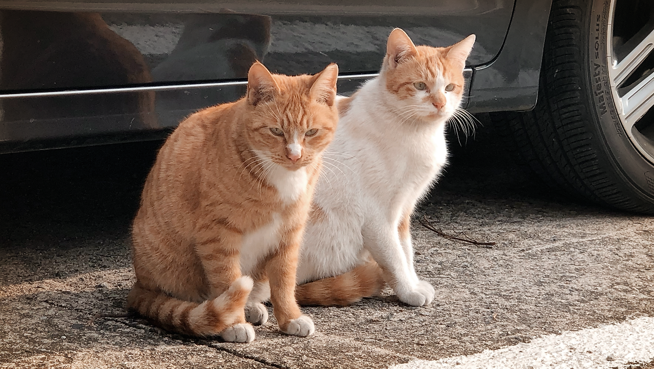 이 아이들은 쌍둥이처럼 닮았다. 두 녀석이 꼭 붙어서 서로 장난친다. 여기서 재미있는 사실은, 이 고양이들이 내가 주는 밥을 먹기 전에 위에서 소개했던 까만 고양이의 눈치를 봤다는 것이다. 마치 두목에게 이 인간의 밥을 먹어도 되는 건지 물어보는 것처럼. 나는 이미 까만 고양이에게 밥을 준 상태였고, 그 까만 고양이에게 허락을 맡은 뒤 두 녀석에게 밥을 먹일 수 있었다. (고맙게도 왼쪽에 있는 녀석이 냥냥 펀치를 휘둘러줬다.)