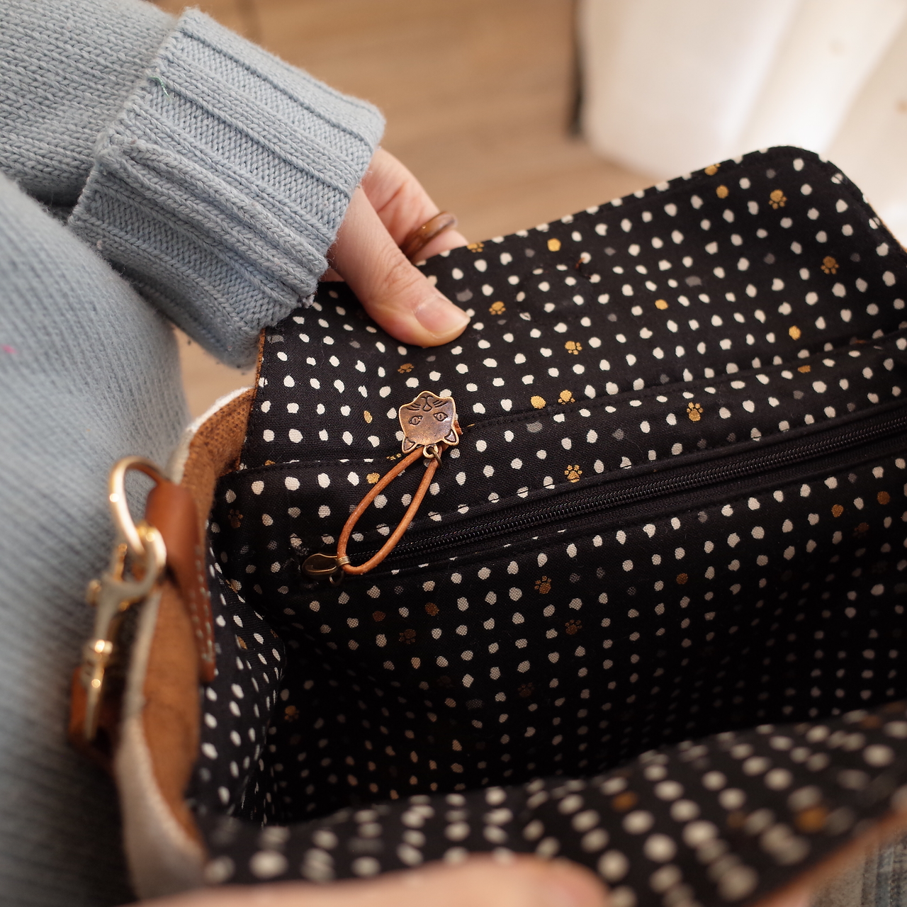 가방 안감은 고급스럽고 겉면과 반전이 돋보이는 컬러인 [블랙이면서 고양이 발바닥 무늬]의 도트 천을 선택했다.