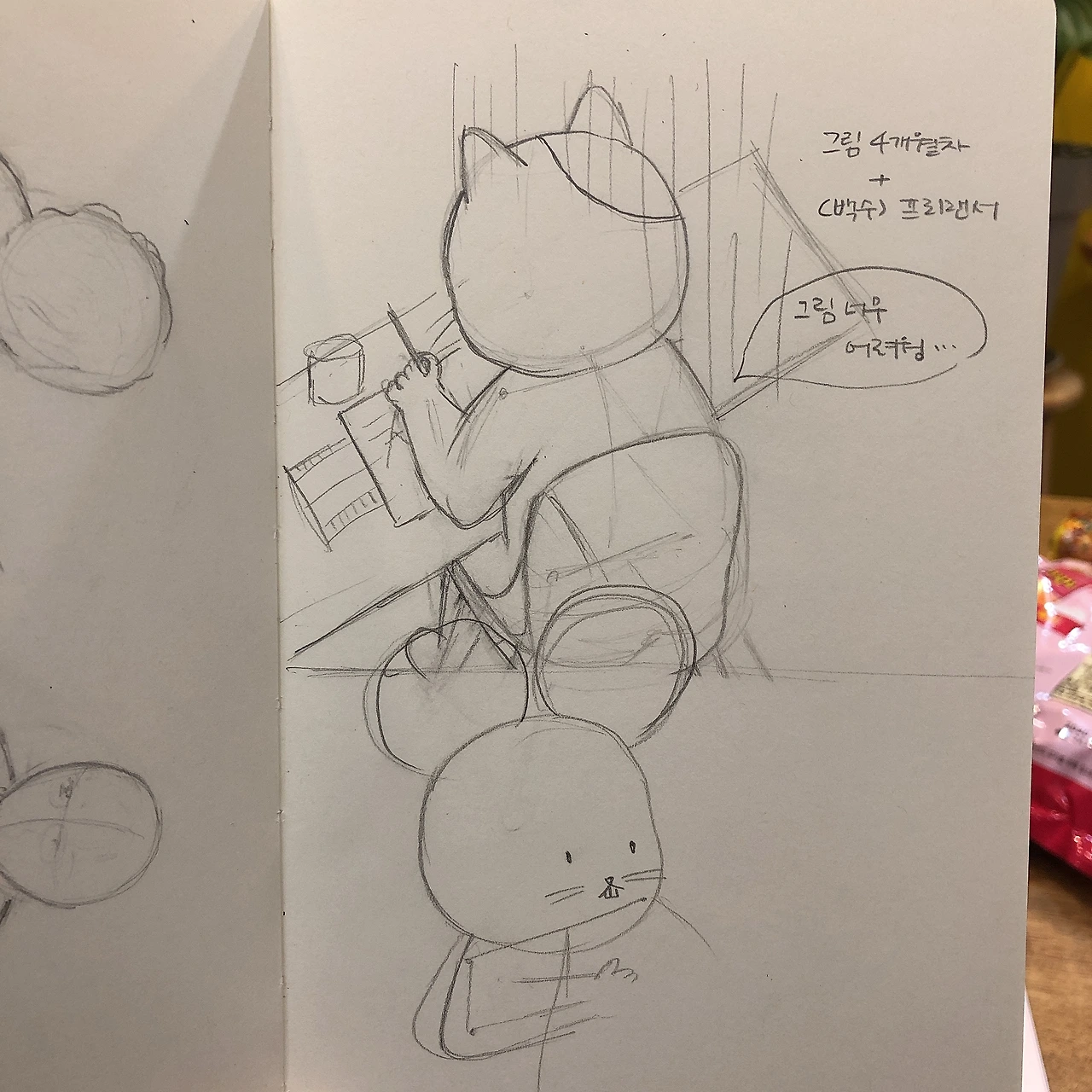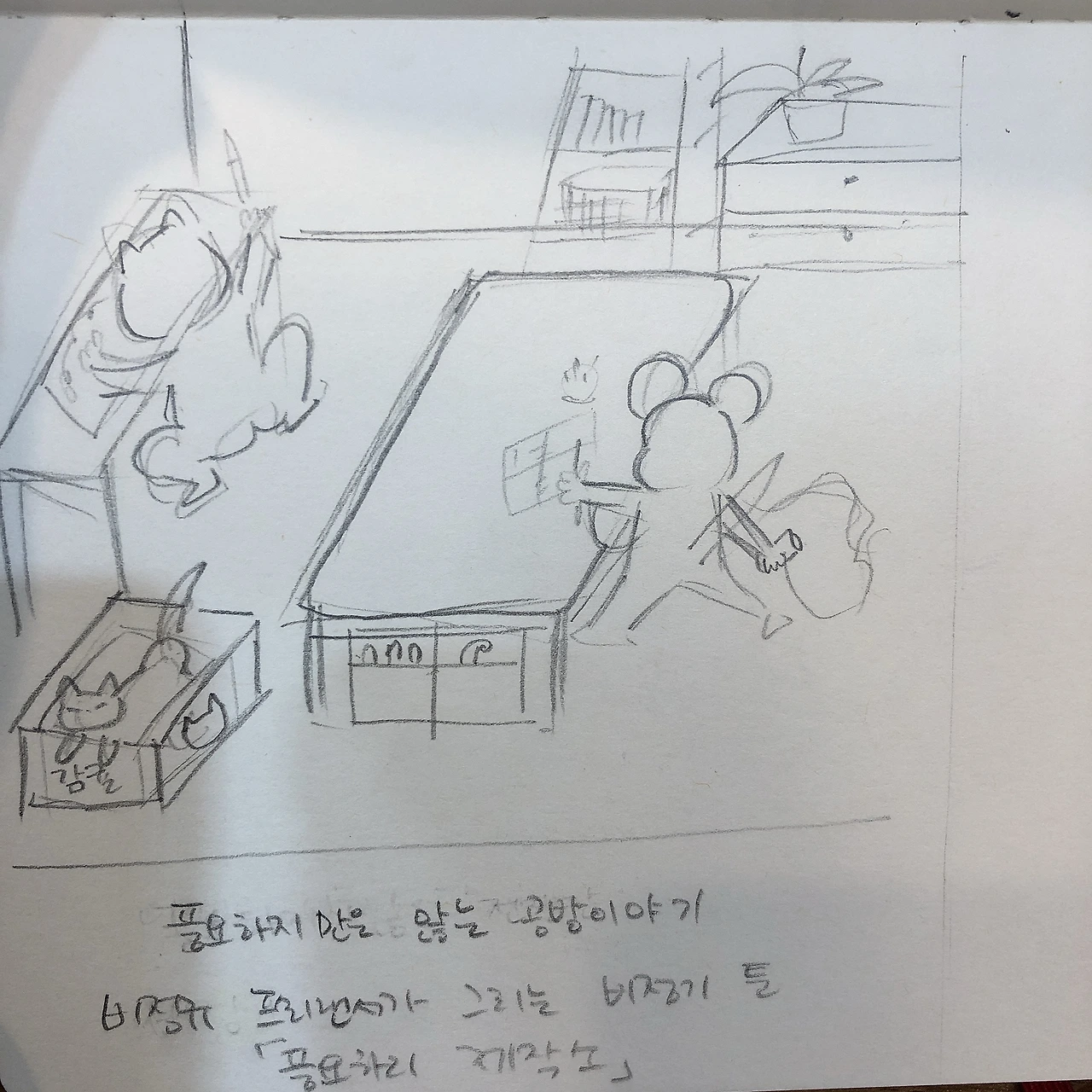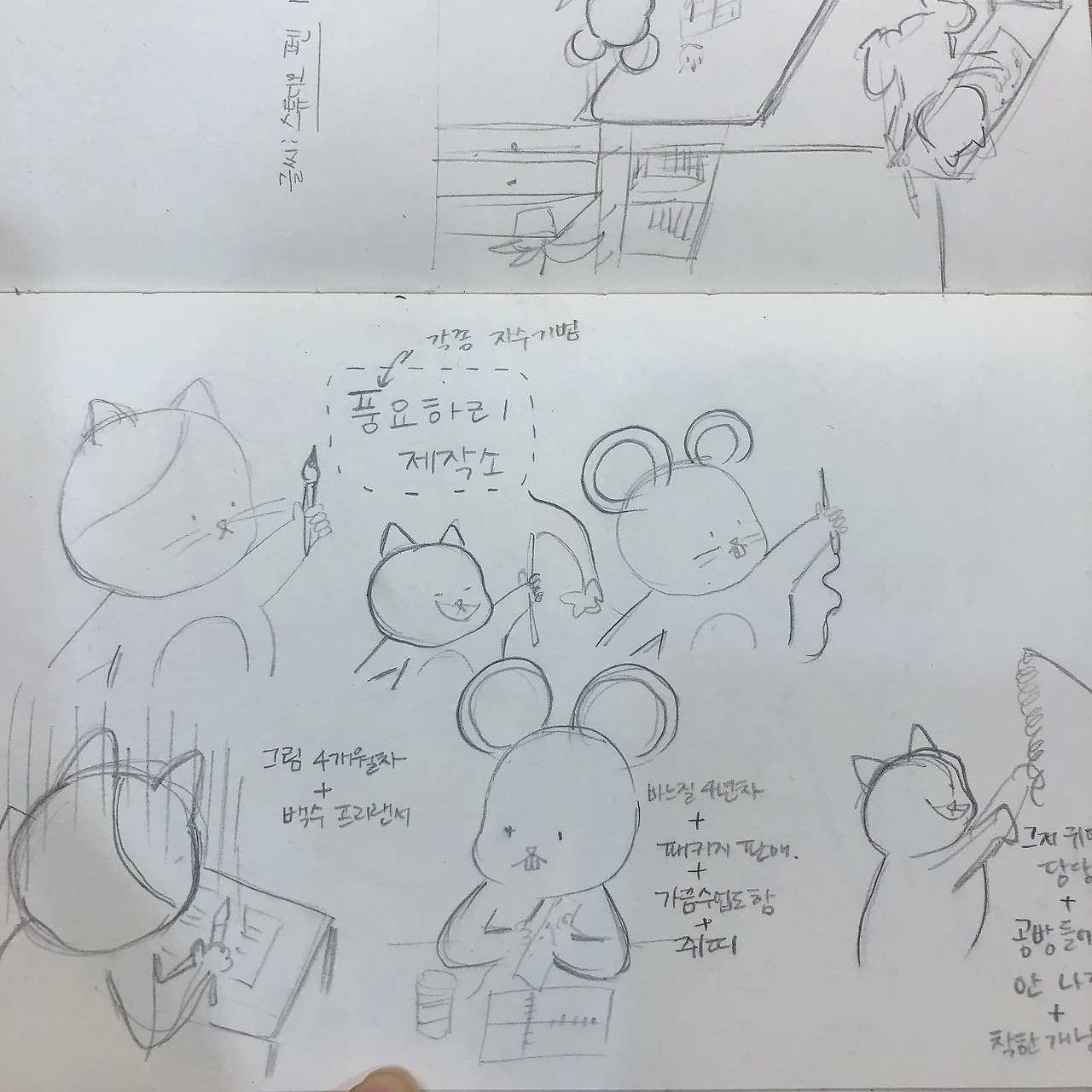지난주, 혼자 점심을 먹다 불현듯 일상툰을 그리고 싶다고 생각했다. 부랴부랴 노트를 꺼내 콘티를 그렸다. 다소 막 그린(?) 흔적이다. 실제 이 이야기가 진짜 웹툰으로 그려졌다. 내가 쓰고 싶은 이야기가 좋은 동력이 되었던 것이다.
